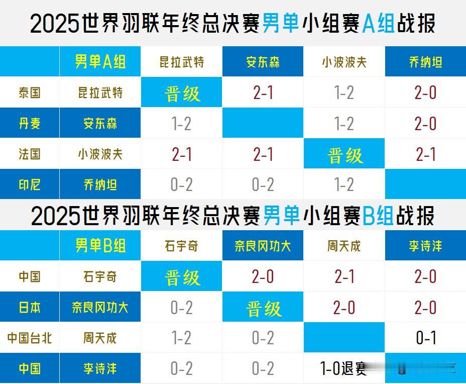 【世界羽联年终总决赛男单小组赛收官!小波波夫和石宇奇分列A组B组第一!】 小波波夫打谁都给2-1,不偏不倚。 昆拉武特昨晚跟安东森同一起点,都是一场完胜,一场三局惜败,都输给了小波波夫。 但安东森输掉了关键战直接对话,只能目送昆拉武特晋级半决赛。 B组,石宇奇有实力有人气,值得期待。 李诗沣的状态来得太晚了,而且因伤退赛很可惜,奈良冈功大前两场势头强劲,遇到石宇奇输得没脾气。