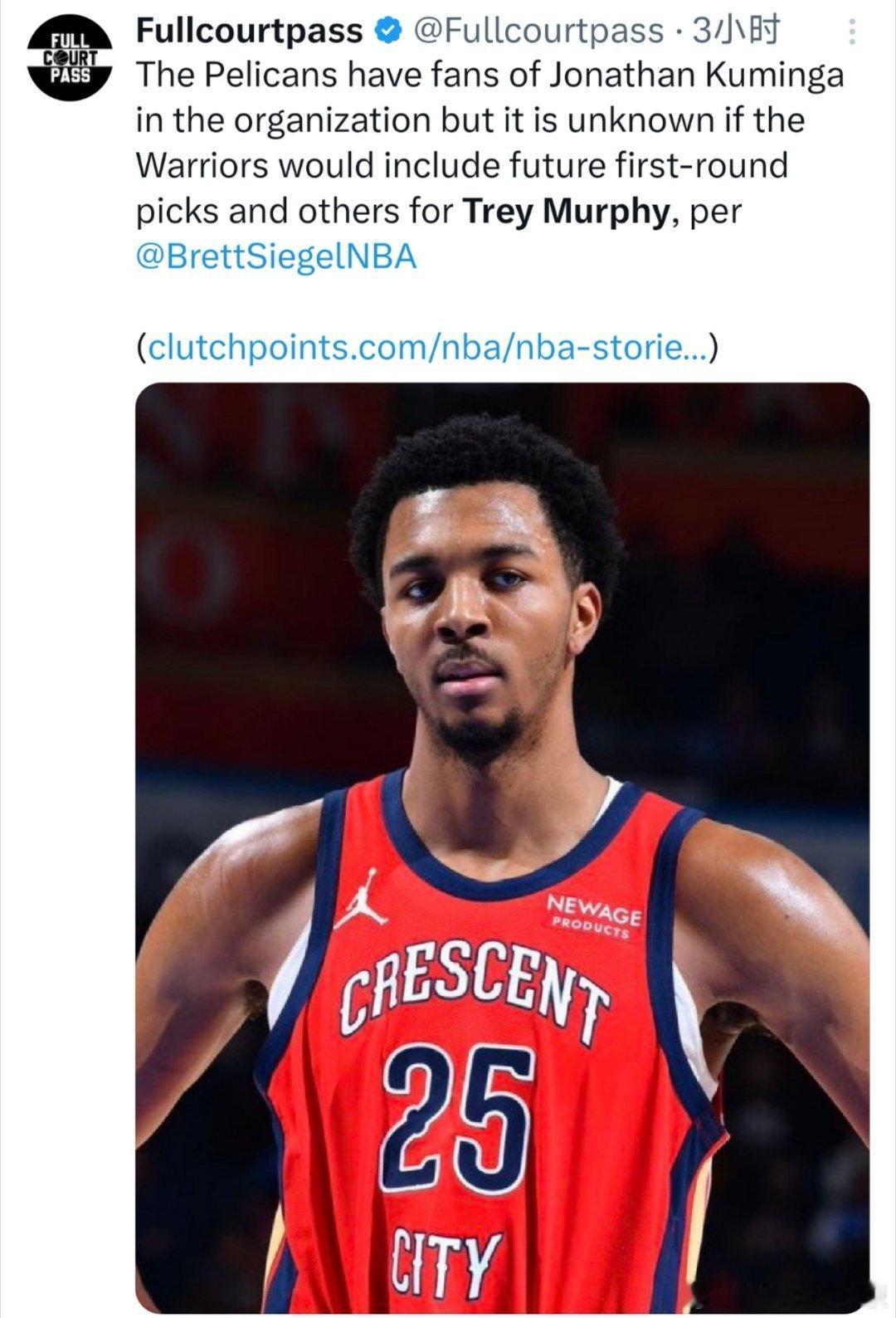 Brett Siegel: 特雷-墨菲三世仍然是勇士的一个交易目标,同时库明加在鹈鹕队内部有一些支持者但目前尚不清楚,勇士是否会愿意为墨菲付出未来首轮以及其他球员。Siegel表示,和鹈鹕进行的任何交易谈判,都需要付出多个首轮签作为基本筹码。墨菲本赛季出战26场,场均21.3分6.4板3.5助1.7断,投篮49.6%,三分36.7%,他的合同还剩下4年1.12亿新赛季篮不住