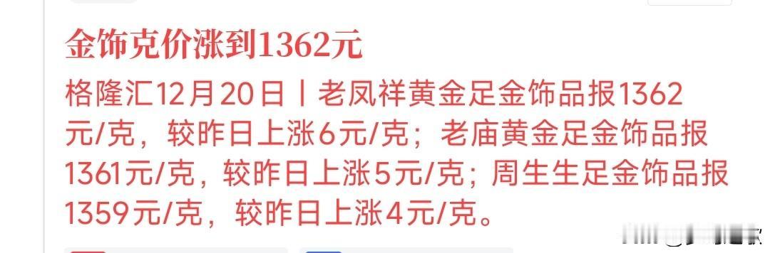 今天去买黄金首饰,看到价格直接惊呆了,看了投资金条的价格更是沉默了 好家伙,加上手工费最便宜的黄金商家也快1360元每克了,这才一个月又涨了每克200元,这简直就是坐火箭的速度。 然而又查了一下国际金价,现货黄金已经达到了4338美元每盎司,去各个银行问了一下想投资金条更是不敢出手。 民生银行:989.15元每克; 建行:991.90元每克; 中行:992.00元每克 交行:992.50元每克 招行:993.60元每克 工行:996.05元每克 农行:1002.3元每克 现在的情况就是美联储大概率在一月还会降息,也就是说黄金的价格还会推高,而且中国一直在囤黄金卖美债。 但现在的价格真的不敢入手,太吓人了
