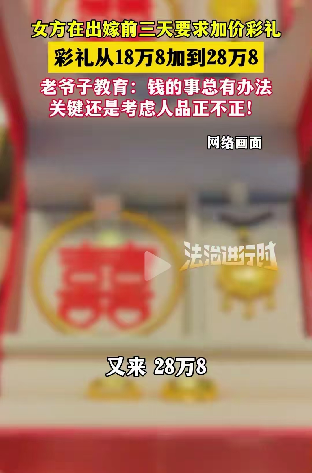 女方在出嫁前三天要求加价彩礼,从18万8加到28万8!男方老爷子教育新郎:“你要好好考虑这门亲事,钱的事总办法,关键还是考虑人品正不正!”网友:如果这个女的真的想嫁给你,她100%的不会向你加彩礼,不服来辩!