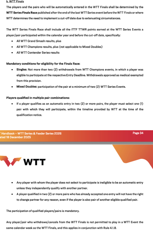 🔶新增参加总决赛积分榜的强制性条件 • 【单打】WTT冠军赛中,球员在相应的报名截止日期前符合参赛资格时最多只能退赛2次。因医疗原因获准退赛的球员不受此限制。 • 【混双】该组合至少参加2站WTT系列赛