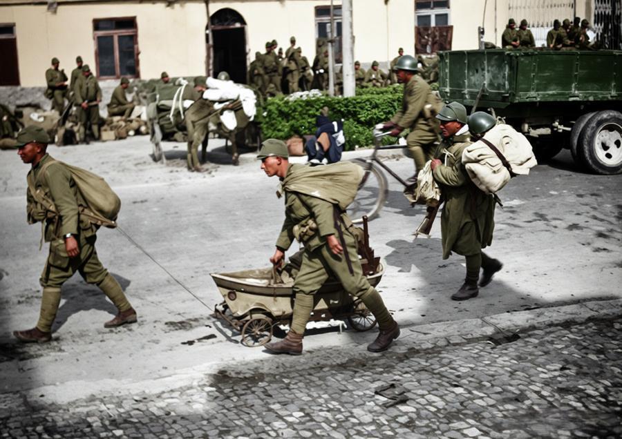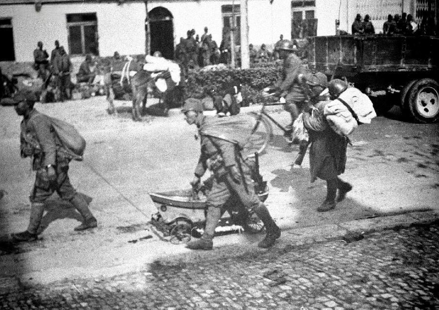 1937年12月,南京沦陷后,日军士兵拖拽着劫掠来的婴儿车,车上堆满了从南京百姓处抢来的物资,有的士兵背着鼓鼓囊囊的包裹,身后还有卡车满载着掠夺品。 后面的建筑旁,聚集着更多日军,整个场景浸着占领者的嚣张——此时的南京,正遭遇惨绝人寰的大屠杀,日军在屠城的同时,也在疯狂洗劫城市的每一处角落。每一件被抢走的物资,都是被践踏的尊严;每一个日军的身影,都是侵略者的罪证。