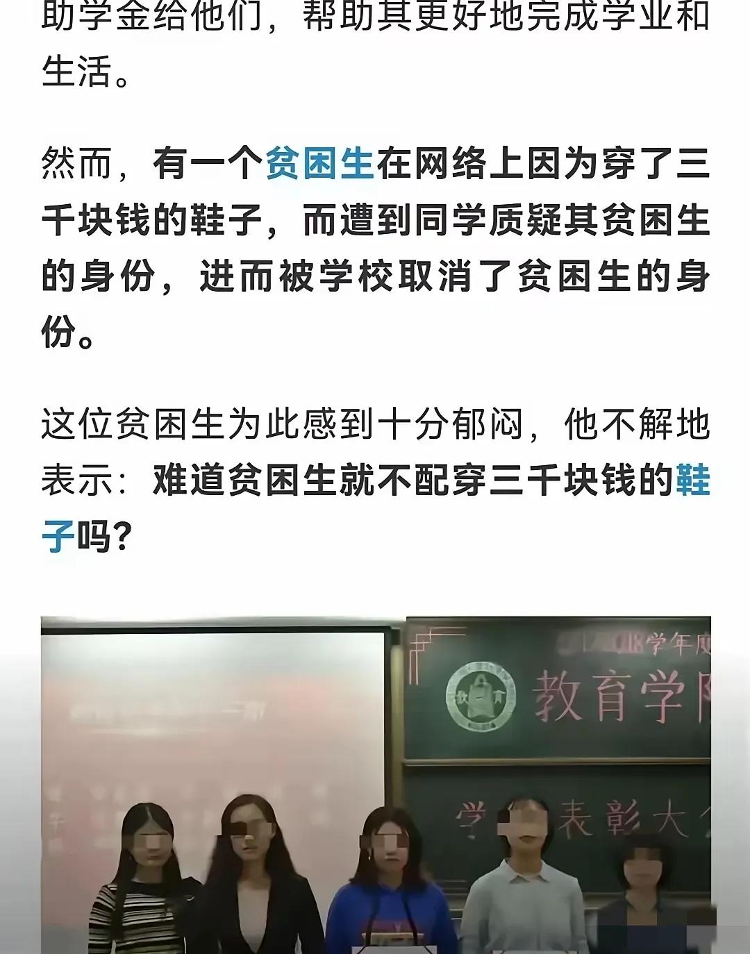 “难道贫困生就不配穿3000块钱的鞋子吗?”这句话确实说错了,应该说:“不是贫困生不配穿三千块的鞋子,而是,都舍得拿3000块钱来买双鞋子的人,根本不配做贫困生,更不配拿贫困生补贴!” 一双价值三千块的鞋,在网络上掀起了轩然大波,一名学生,因为穿了这双鞋,被认定不符合贫困生资助条件,失去了资助资格。 随之而来的,是舆论的热议:贫困生到底能不能穿贵的鞋?这个事件,让我想起了米莱和她丈夫的生活。 米莱(化名)和丈夫每月收入过万,在很多人眼里,这个数字已经算高,但实际生活却远比数字复杂。 家里有老人需要照顾,孩子还在上学,还有房贷和车贷压在肩上,每到节日或者孩子开学,账本一算,总觉得钱不够用。 小病小痛,他们能扛就扛,去医院是大开销,米莱的童年同样不容易,她从小就是孤儿,家里经常揭不开锅。 上学时,学费总是拖欠,有一次差点交不上,但老师体谅家庭困难,让她先来上课,学费以后再慢慢补齐,这段经历让她对“贫困”二字有着非常直观的理解。 再看看那个因为买鞋而失去资助资格的学生,他同样被称为“贫困生”,却能够轻而易举地花三千块在一双鞋上。 这笔钱,对很多家庭来说,可能是两个月甚至半年的生活开销,而他却毫不犹豫地花掉,这样一对比,不禁让人思考:“贫困生”的身份,到底意味着什么? 现实中,贫困不能仅靠收入来判断,像米莱夫妇,收入过万,却因为家庭负担大、支出多,生活仍然紧巴巴。 而有些家庭,收入可能不高,但手里有房子、车子等资产,生活压力未必大,家庭的债务、医疗开销、子女教育支出等,都应该纳入判断标准,这样才能更准确地找到真正需要帮助的人。 回到“3000块的鞋”,贫困生当然可以追求更好的生活,但前提是不能透支未来、牺牲教育资源。 如果拿着资助金过着明显富裕的生活,这不仅是对资助资源的浪费,也对其他真正需要帮助的学生不公平。 这个事件暴露的,不仅是部分学生消费观的问题,也显示了贫困生资助体系存在漏洞,如何更精准地认定贫困生,如何有效监督资助资金的使用,如何引导学生建立合理的消费观?这些都是必须面对的问题。 有人说,现在贫困生认定存在悖论:有的学生开豪车住廉租房,有的开公司领低保,这让资助体系的公信力受损,也让真正需要帮助的学生感到困惑。 解决问题需要多方面的努力:学校应在教育中引导学生正确理解金钱和消费,家庭从小培养孩子的节俭意识和理财能力,社会则提供实实在在的帮助,让孩子在公平环境中成长。 完善贫困生资助体系,是一项长期的任务,不能因为个别事件就否定整个制度,也不能因为存在漏洞就忽视那些真正需要帮助的孩子。 每一笔资助,都应该用在真正需要的人身上,让每个孩子都能获得公平的教育机会。 米莱的故事,也许只是众多贫困家庭的缩影,她的经历让人感受到生活的不易,也感受到对知识和教育的渴望。 而“3000块的鞋”,提醒我们,资助不仅是金钱的支持,更是对学生精神世界的关心,是对价值观的引导。 未来,如何更有效地帮助贫困生,如何建立公平、完善的资助体系,这些问题都值得社会不断探索和努力。尊重、理解和支持,永远是最重要的。