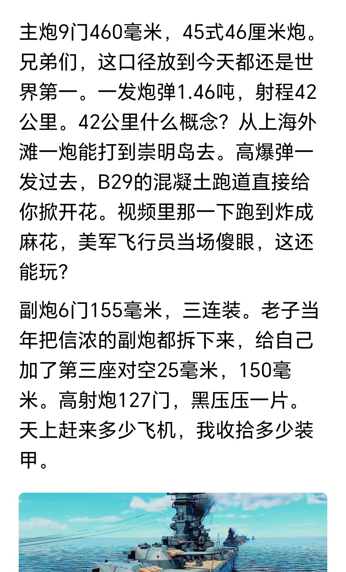 网上有人吹嘘,一艘二战时期日本70000吨的大和号战列舰,几发400mm口径,1400kg,射程42千米的炮弹就能击沉一艘航母。你想啥呢,可以这么说,别说射程42千米,就是420千米,也别想打到任何一艘军舰,而别人打你,是分分钟钟的事,几艘220吨位的022高速导弹艇在北斗卫星的导航下就能在1000km外搞定你(最新型导弹射程1500公里)。火箭炮射程300-600km,增程加农炮,射程70-100km,你42千米,有用吗!