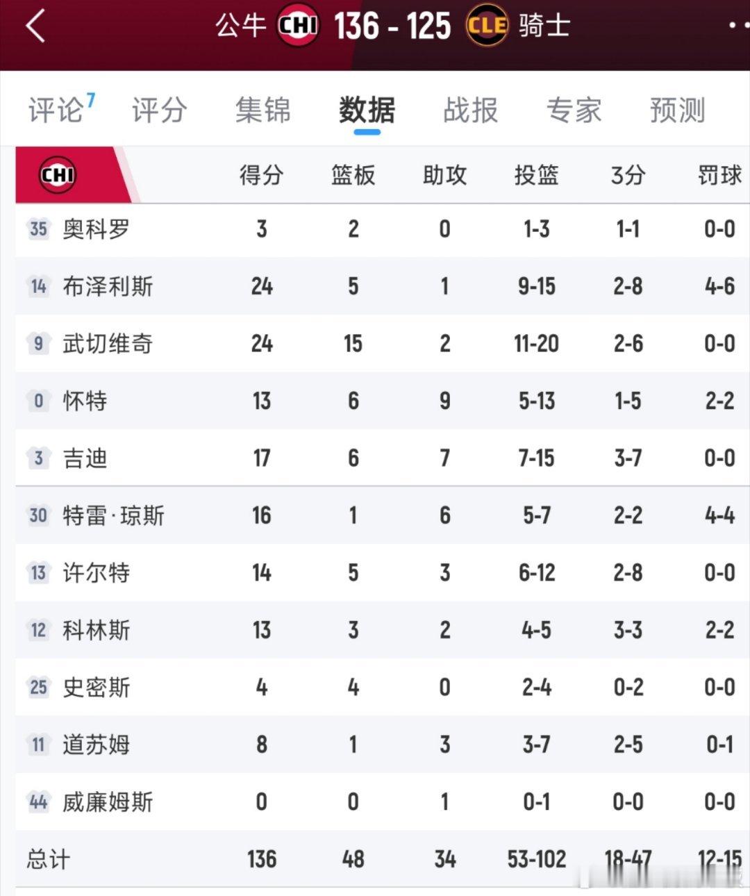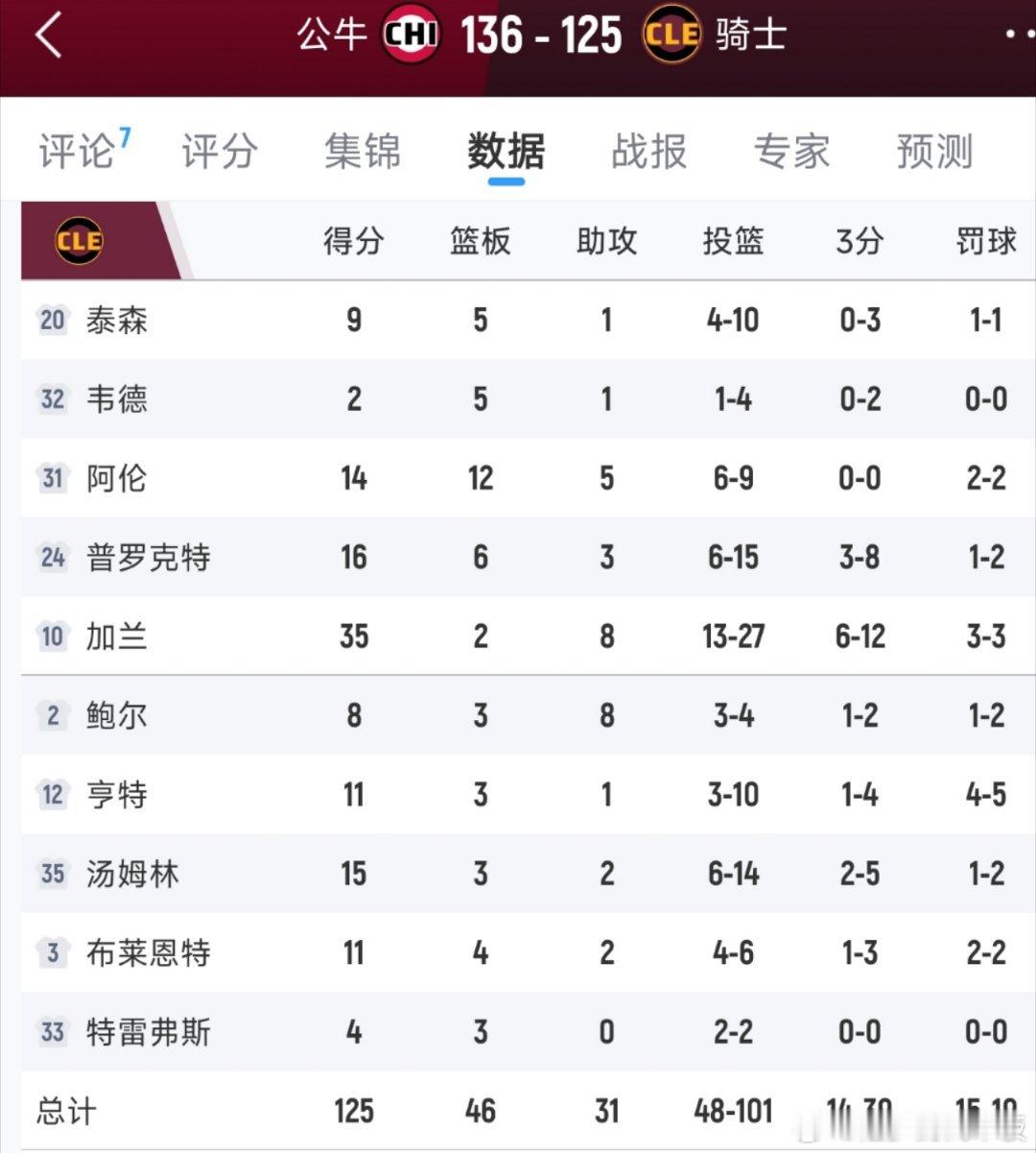 骑士主场125-136不敌公牛,遭遇3连败,3天内被对手双杀!加兰35分8助,阿伦14分12板,米切尔和莫布利缺席;布泽利斯24分,武切维奇24分15板,吉迪17分6板7助公牛vs骑士