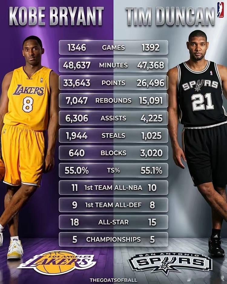 科比、邓肯生涯数据对比:场次:科比1346——邓肯1392☝总时间:48637✅——47369总得分:33643✅——26496总篮板:7047——15091☝总助攻:6306✅——4225总抢断:1944✅——1025总盖帽:640——3020☝真实命中率:55%——55.1%☝一阵:11次✅——10次一防:9次✅——8次全明星:18次✅——15次总冠军:5个——5个MVP:1个——2个☝FMVP:2个——3个☝