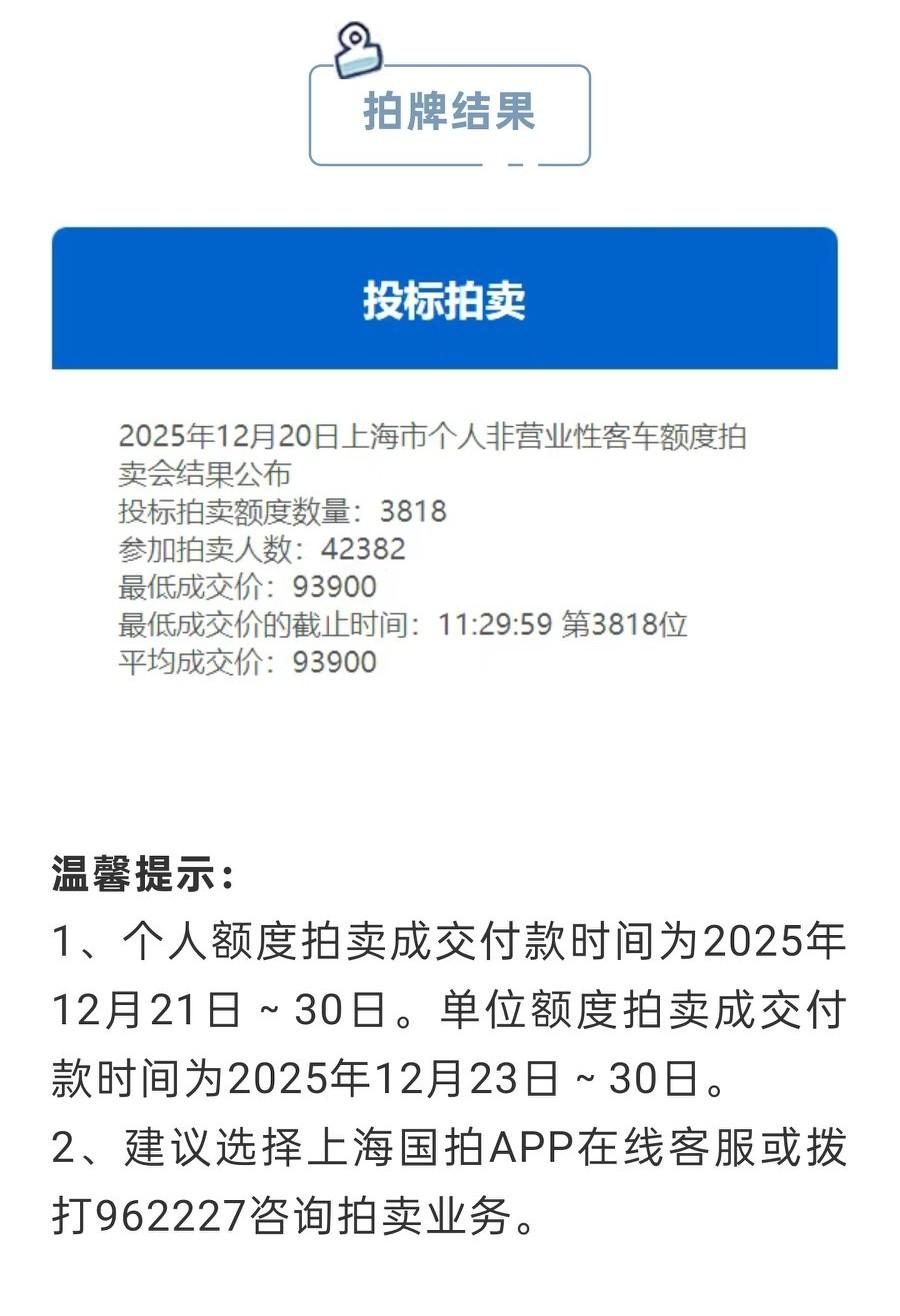 上海的交通控制合理,沪牌继续竞拍限购! 12月沪牌拍卖结果有点意思。 个人额度拍卖总数3818个,42382人参与,中标率9.0%,最低和平均成交价都是93900元,比上月涨了186元,最低成交价在图片里。 上海的交通这几年真的是越来越拥堵,合理竞拍也是严格的控制了拥堵的情况,可以缓慢增长。 拍中的记得在规定时间付钱,毕竟现在拍到也是好的,蓝牌毕竟没有沪牌好! 小编的宝马车还在等沪牌,下个月继续拍😎
