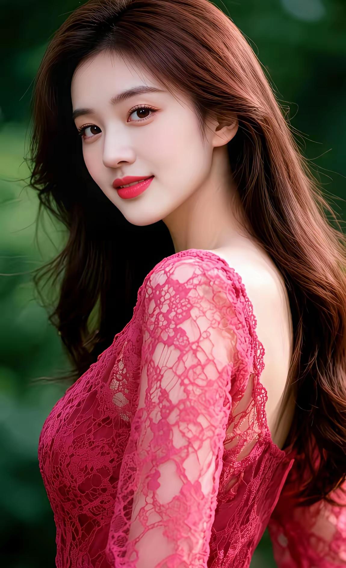 甜美少女心,粉色蕾丝裙,自然妆容,清新自然。