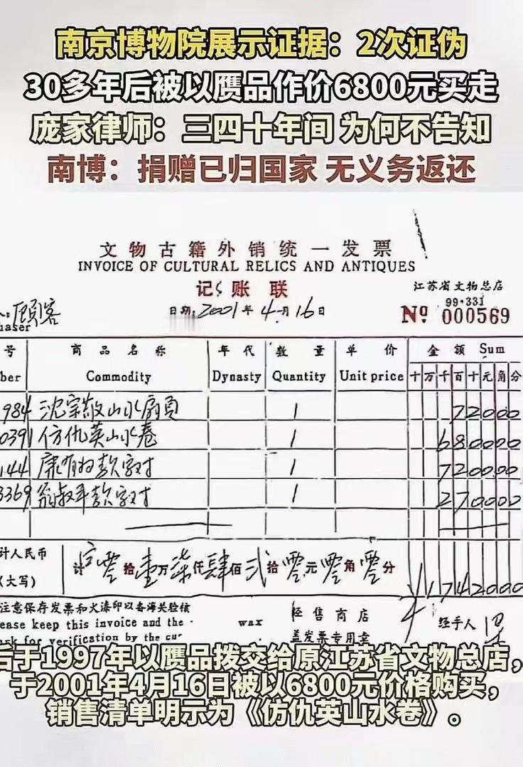 南京博物院,2001年4月以赝品《仿仇英山水卷》之名和6800元价格向“顾客”售卖后,到2025年该作品再以《仇英山水卷》之名个8800万元起拍价进行拍卖,算不算是有史以来最昂贵的“挂羊头卖狗肉”?