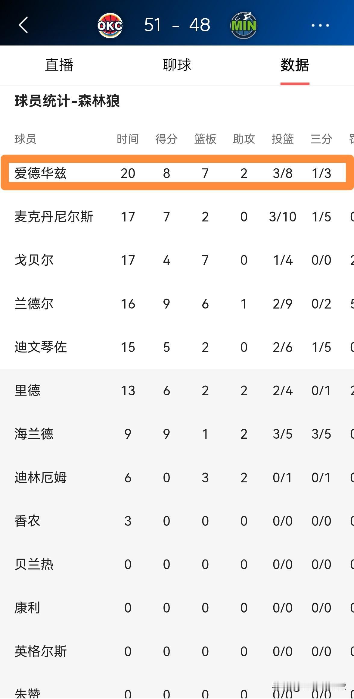 森林狼当家球星爱德华兹真是太差劲了!在今天森林狼主场迎战雷霆的比赛中,目前双方的上半场比赛已经结束,森林狼以48:51落后于对手。让人感到非常失望的是,在前两节比赛中,爱德华兹首发出战20分钟,投篮8中3,其中三分球3中1、罚球2中1仅仅得到8分,还出现了2次失误,他的场上正负值为-6。 坦白说,在上半场比赛中,爱德华兹在个人表现方面完败于超级巨星亚历山大。