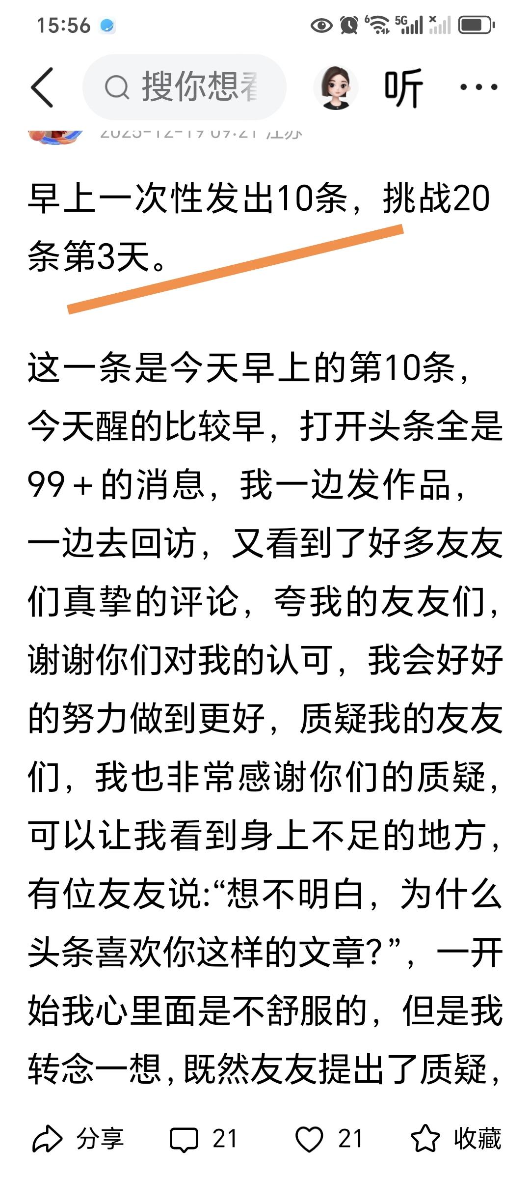 看到别人发的微头条,我知道自己为什么流量少了。 有朋友说他每天会要求自己发20个微头条,而且已经连续坚持几天了。他秉承广撒网,以量取胜,多发内容,出爆款的机会才多。 而我一天发一两条内容,有时都不知道能写什么。真不知道那位朋友哪来那么多灵感? 以前我觉得自己流量差,现在看看别人发那么多,再看看自己发的数量,我的数据能好才怪。 你们觉得一天发多少微头条合适?