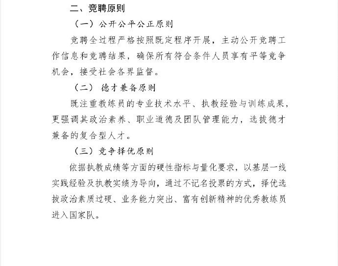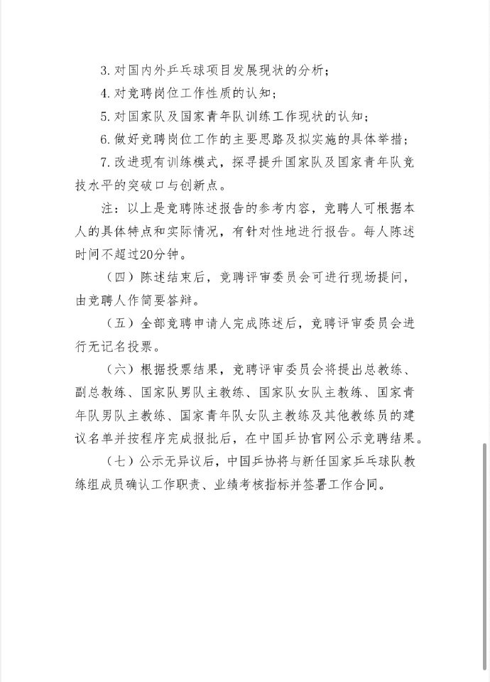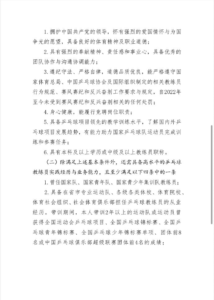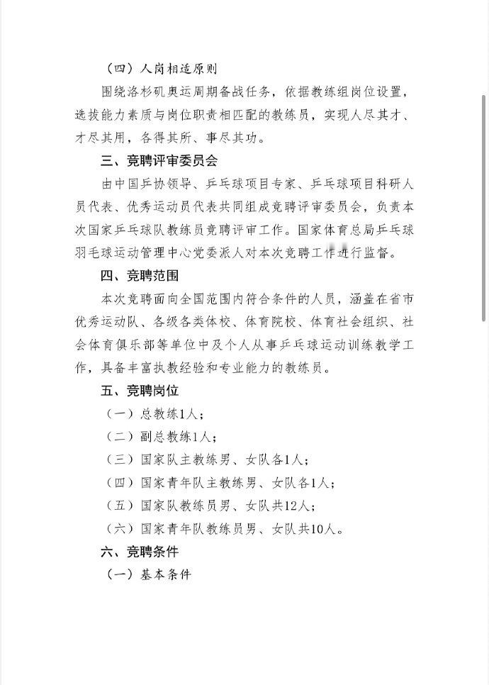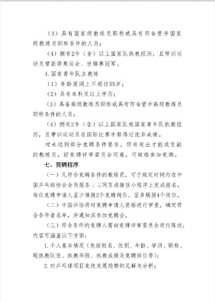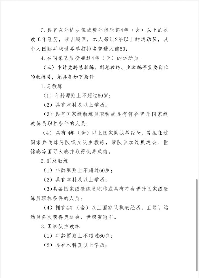 国乒教练员竞聘工作方案中国乒协公布洛杉矶奥运周期国家乒乓球队教练员竞聘工作方案:竞聘原则:公开公平公正原则,德才兼备原则,竞争择优原则,人岗相适原则竞聘范围:本次竞聘面向全国范围内符合条件的人员,涵盖在省市优秀运动队、各级各类体校、体育院校、体育社会组织、社会体育俱乐部等单位中及个人从事乒乓球运动训练教学工作,具备丰富执教经验和专业能力的教练员。总教练:年龄原则上不超过60岁;具有本科及以上学历;具有国家级教练员职称或具有符合晋升国家级教练员职称条件的人员;具有 4年(含)以上国家队执教经历,曾担任过国家乒乓球男队或女队主教练,带队参加过奥运会、世锦赛等国际大赛并取得优异成绩。副总教练:年龄原则上不超过60岁;具有本科及以上学历;具备国家级教练员职称或具有符合晋升国家级教练员职称条件的人员;拥有4年(含)以上国家队执教经历,且带训运动员多次获得奥运会、世锦赛冠军。国家队主教练:年龄原则上不超过60岁;具有本科及以上学历;具有国家级教练员职称或具有符合晋升国家级教练员职称条件的人员;拥有2年(含)以上国家队执教经历,且带训运动员曾获得奥运会、世锦赛冠军。国家青年队主教练:年龄原则上不超过55岁;具有本科及以上学历;具备高级教练员职称或具有符合晋升高级教练员职称条件的人员;拥有2年(含)以上国家队或国家青年队执教经历,且带训运动员在国际比赛中取得过优异成绩。对未达到部分竞聘条件要求,但有突出才能或贡献的教练员,经竞聘评审委员会同意,可破格参加竞聘。