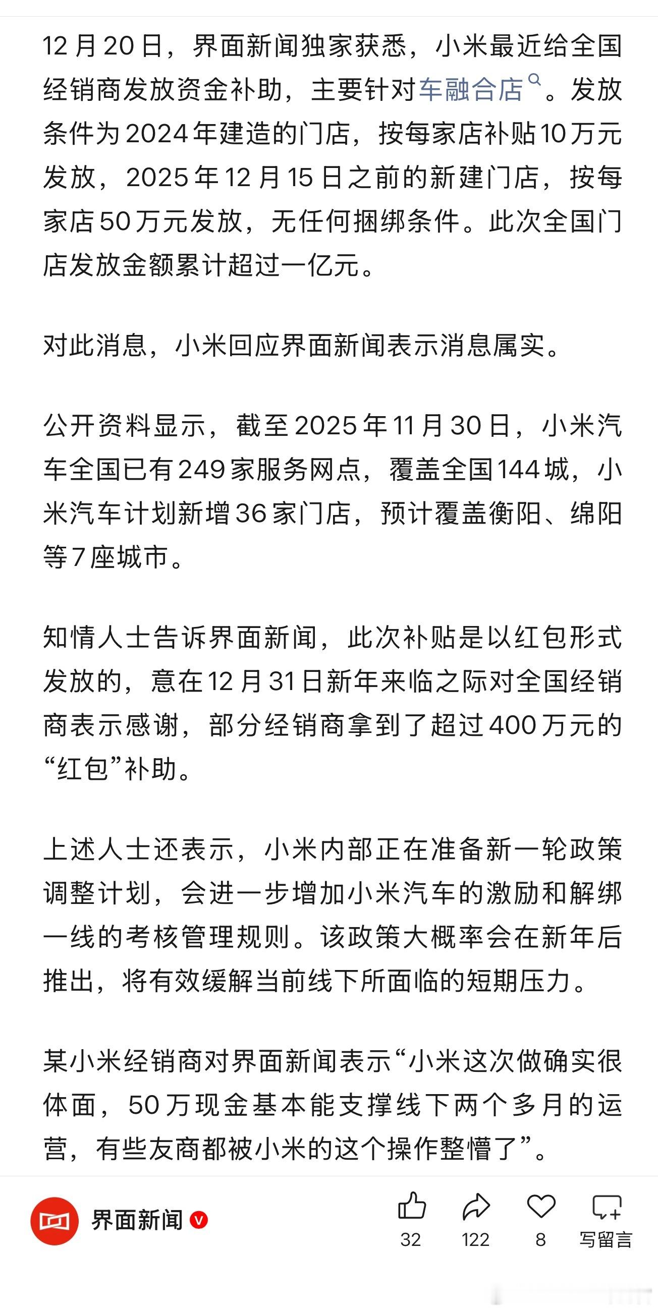 小米给经销商发放资金补助,主要针对车融合店,总计发了一个多亿