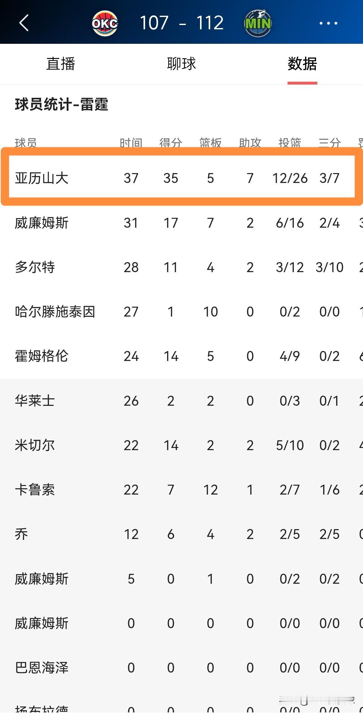 雷霆当家球星亚历山大必须要背锅了!在今天雷霆客场以107:112不敌森林狼的比赛中,尽管亚历山大爆砍35分5篮板7助攻2抢断2盖帽,但是他在比赛最后时刻的糟糕表现导致球队输掉了比赛,亚历山大必须为球队的失利负主要责任。 在第四节比赛的最后时刻,亚历山大先是在一次突破上篮时遭到了爱德华兹的封盖,随后亚历山大又遭到了爱德华兹的抢断,雷霆彻底的失去了逆转翻盘的希望。