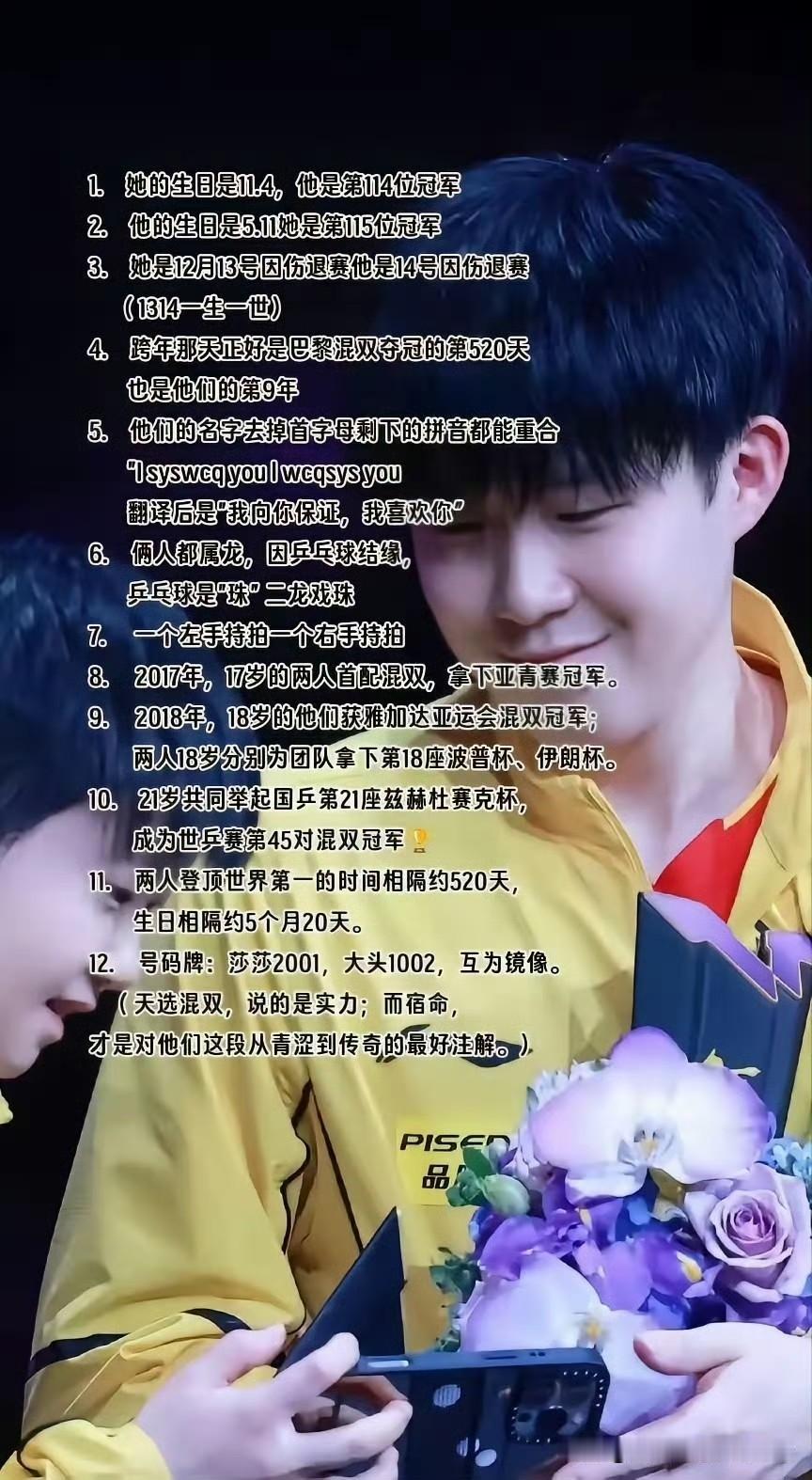 莎头组合的玄学巧合,宿命感拉满 提到国乒莎头组合,除了赛场上的默契配合,他们俩人之间的玄学巧合更是让网友直呼“宿命感爆棚”。 生日、冠军位次、退赛日期暗藏114、1314等浪漫数字,名字拼音拆解后还能拼出“我向你保证,我喜欢你”的告白。 同为属龙的两人,一左一右持拍,从17岁首配混双夺冠,到携手拿下世乒赛冠军,成长轨迹高度契合。 登顶世界第一的时间相隔520天、号码牌互为镜像,这些看似偶然的细节,让莎头的羁绊多了层命中注定的色彩。