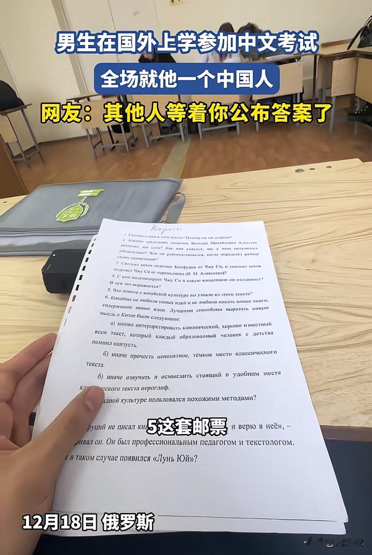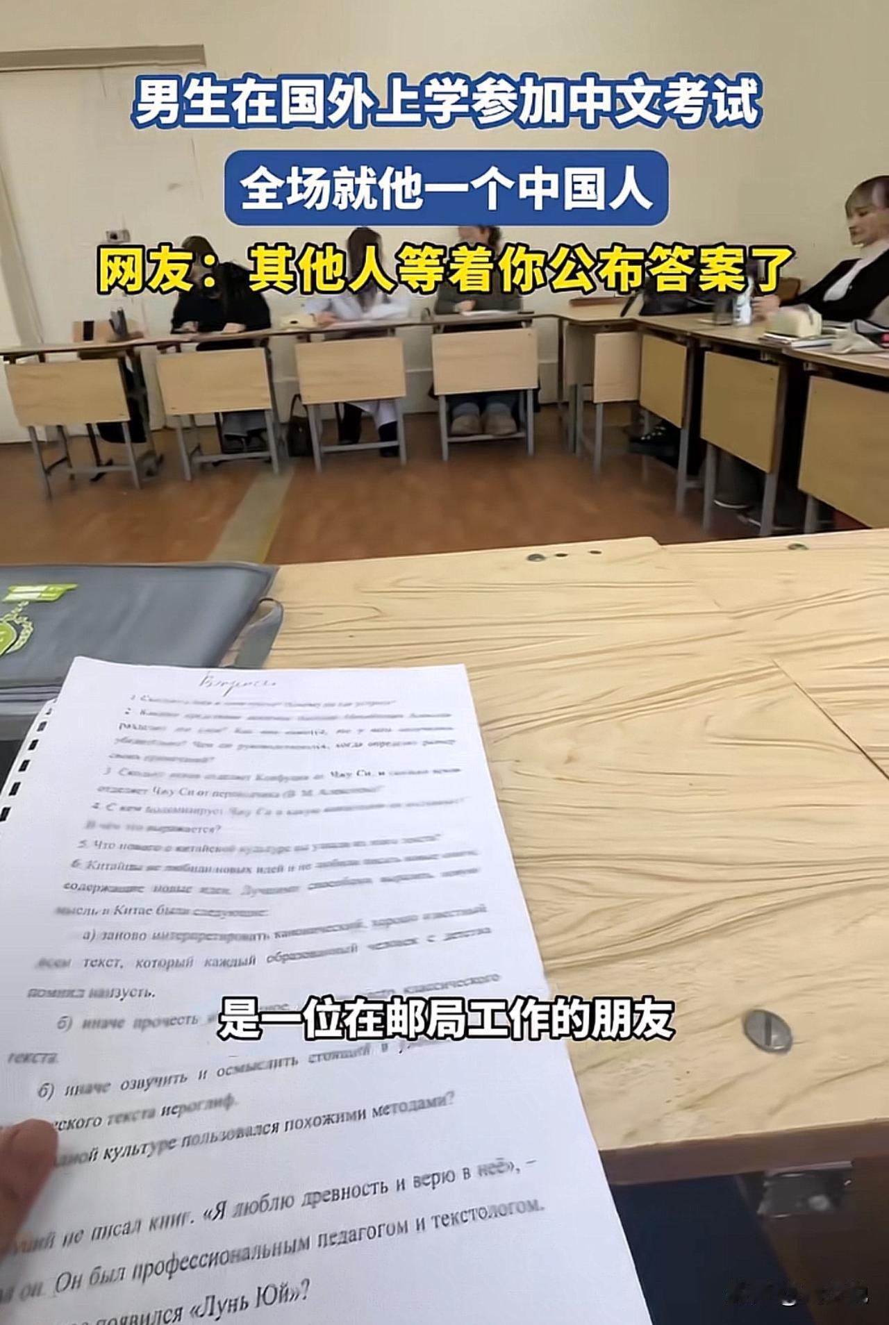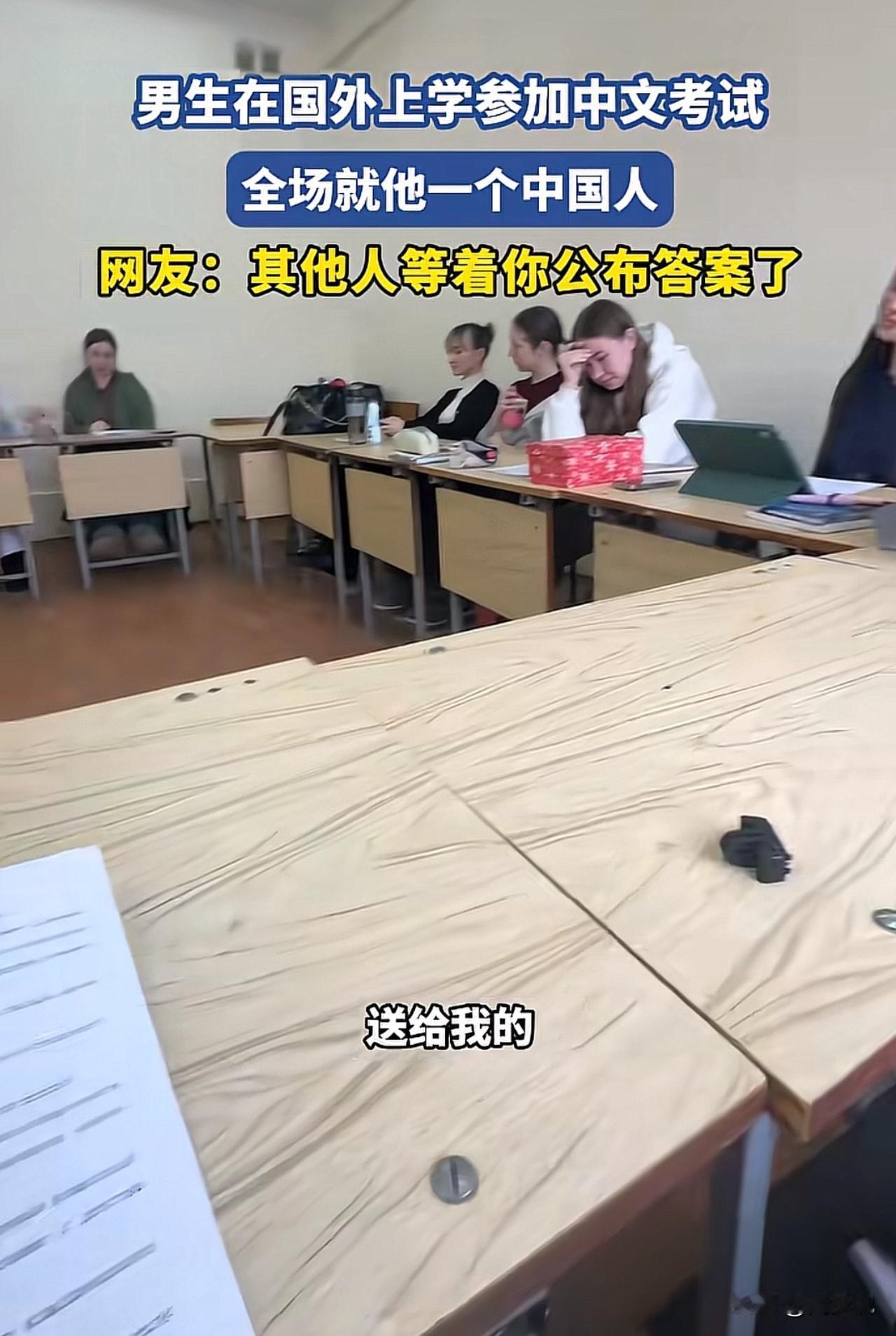 “笑哭!”一位男生在国外上学,没想到中文考试全场就他一个中国人!网友:其他人等着你公布答案了。 国外一所大学的中文考场里,一位男生刚走进教室,整个人愣住了。教室里坐着的,全是外国同学,他是唯一的中国面孔。 他本来以为,自己只是来“走个流程”的中文考试,没想到成了全场“焦点人物”。 这件事被他发到网上后,很快引来热议。有网友调侃:“这就是传说中的全场等你带飞。” 也有人说:“别笑,其实挺心酸的,在国外一个人坚持说中文、学中文,真不容易。” 还有网友感叹:“突然懂了什么叫文化自信,不是喊口号,而是在别人的语言考试里,你能轻松写完一份中文试卷。” 在周少看来,这个场景表面是个段子,背后其实是一堂生动的“教育课”。语言从来不是简单的“工具”,而是身份和文化的一部分。 这个男生,也许只是安静地完成了一场考试,但他用最普通的方式,上了一堂比分数更重要的课:记住母语,就是记住自己的根。#寻美三湘# #长沙新朋友#