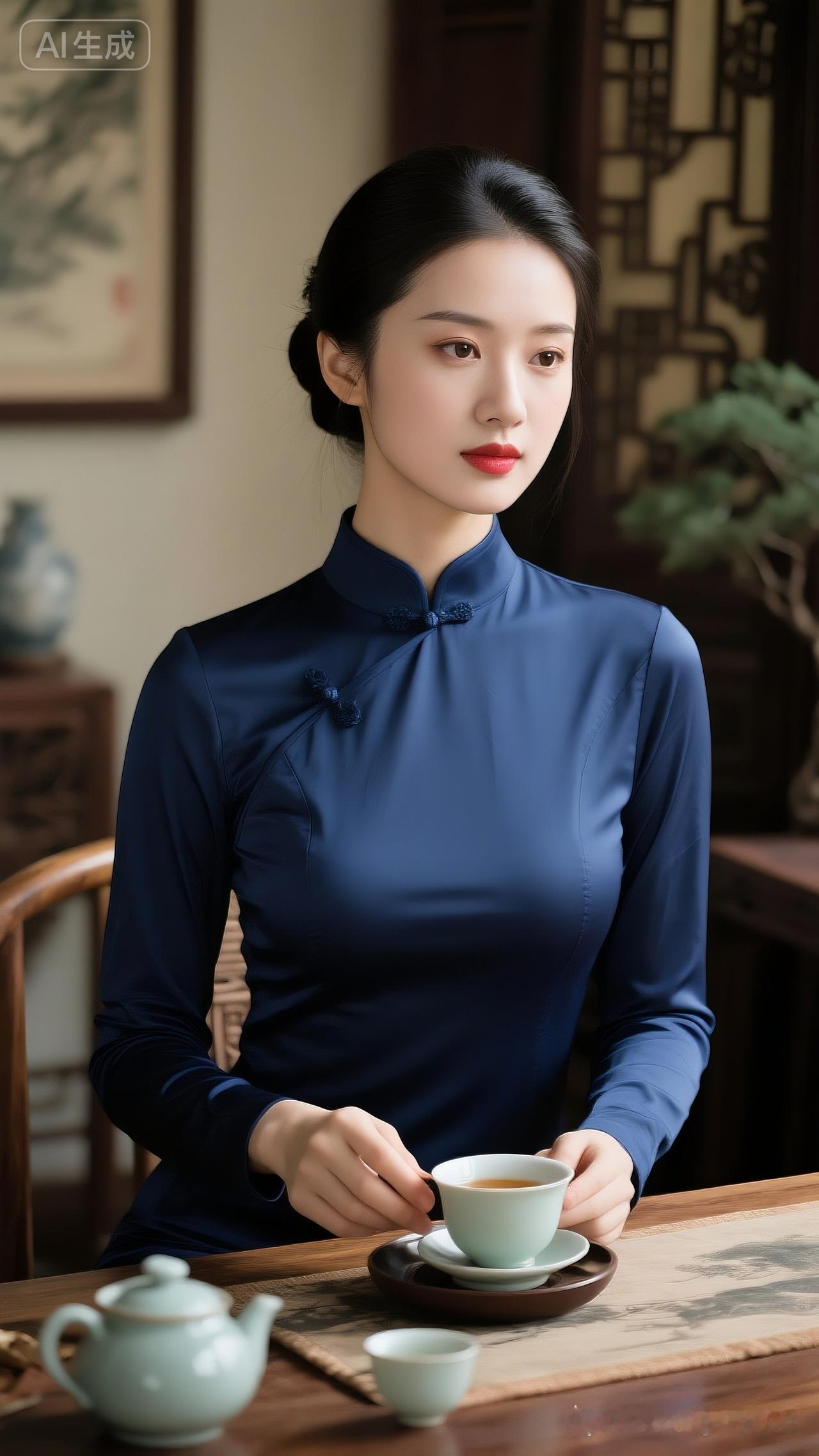 优雅蓝旗袍,茶香满心间,静享东方韵味。