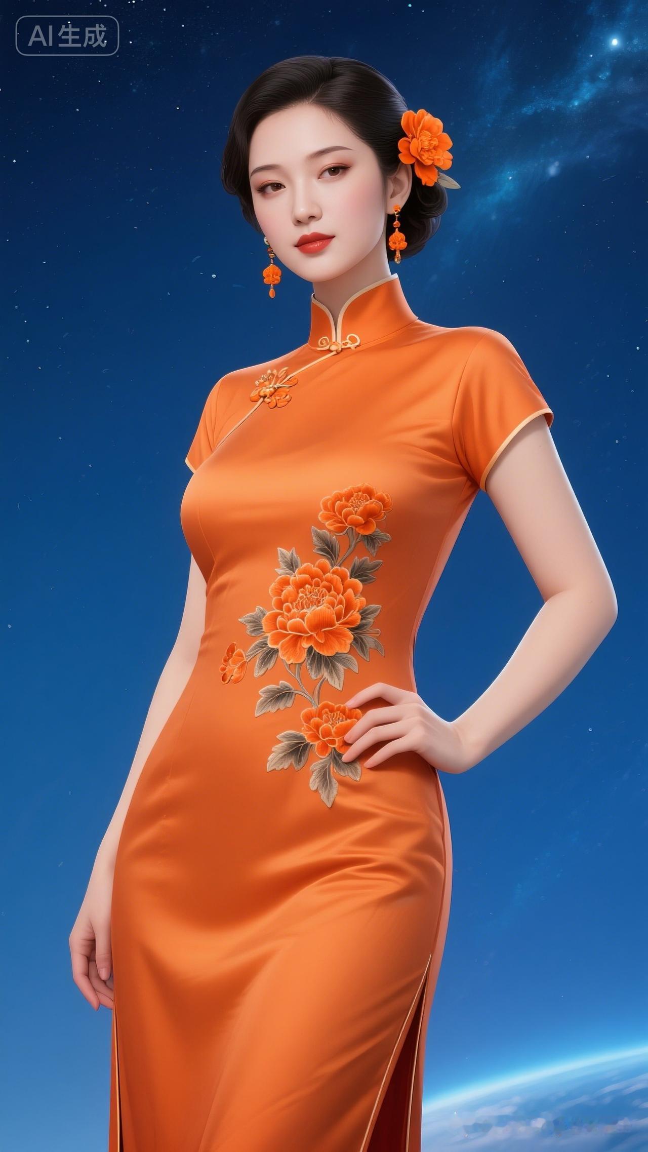 穿橙色旗袍的漂亮姑娘,祝她幸福快乐每一天。
