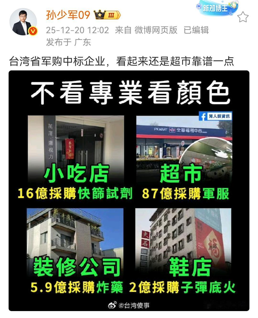 孙少军:台湾省军购中标企业,看起来还是超市靠谱一点 ! 台湾省中标的单位真的是非常的奇葩,扒开背后的中标资质看,这种是明显是不符合中标的资格的。 4个中标单位一对比,确实是这家超市更加符合标准,毕竟超市的规模大,能销售服装也不是什么难事。 各位是怎么看的?欢迎评论区留言。