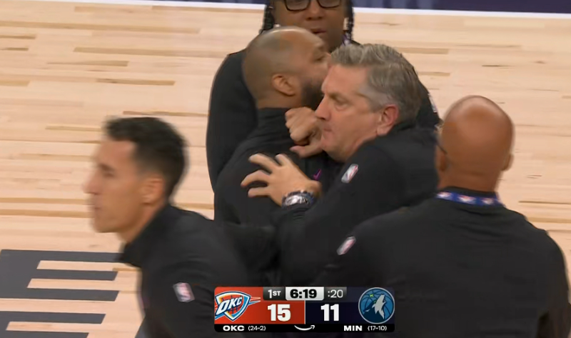华子那球没吹,兰德尔接着补也没吹,加上前面的回合,芬奇教练直接暴走,要冲上去干裁判…