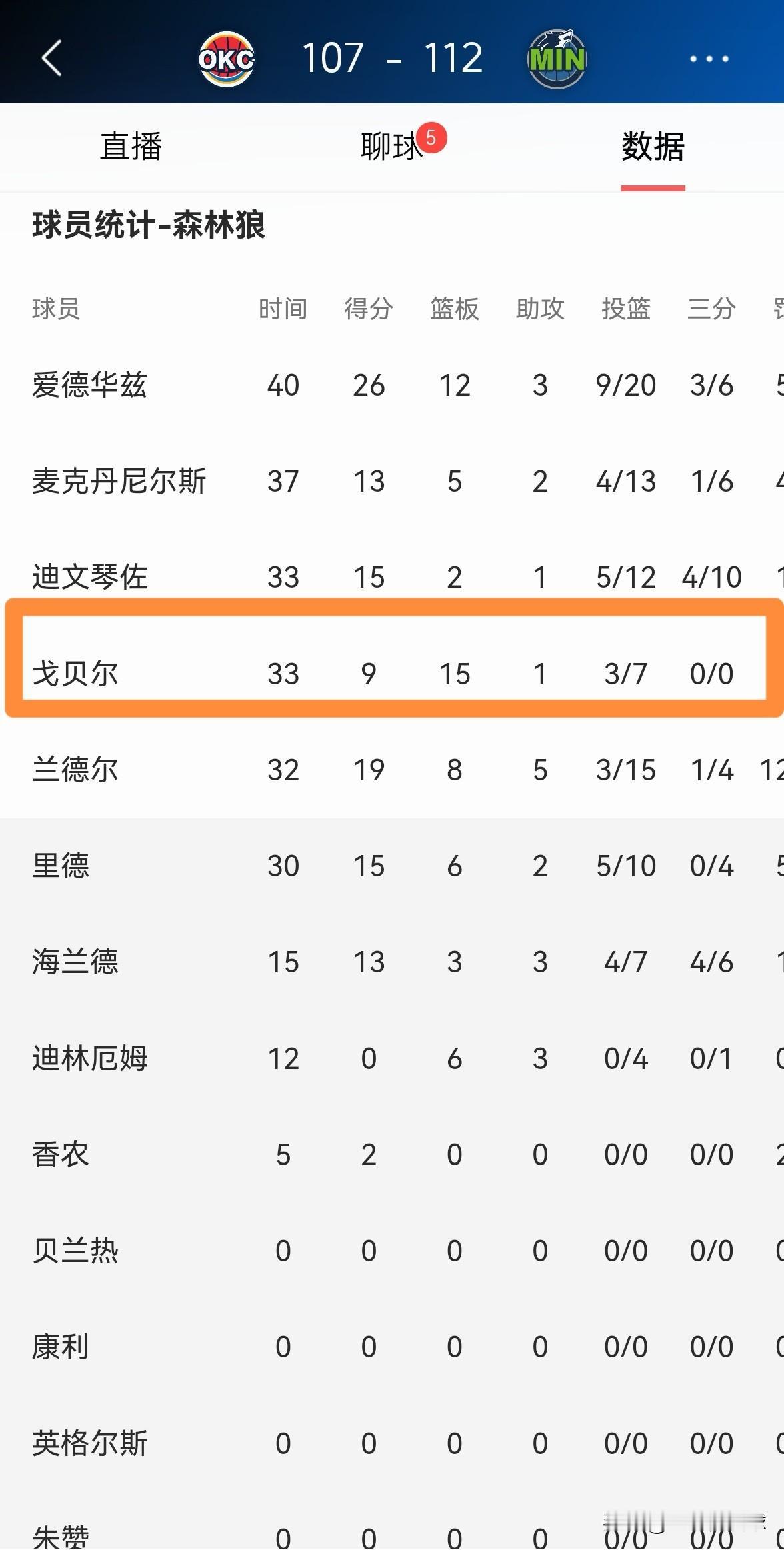 森林狼老将戈贝尔真是一头篮板怪兽!在今天森林狼主场以112:107击败雷霆的比赛中,戈贝尔首发出战33分钟,投篮7中3,其中罚球7中3得到9分,却拼抢到了全队最多的15个篮板,其中包括7个前场篮板。 这就是戈贝尔能够屡次签下大合同的原因,虽然他在进攻端的戏份不多,但是他在篮板球保护和防守端是绝对的核心。