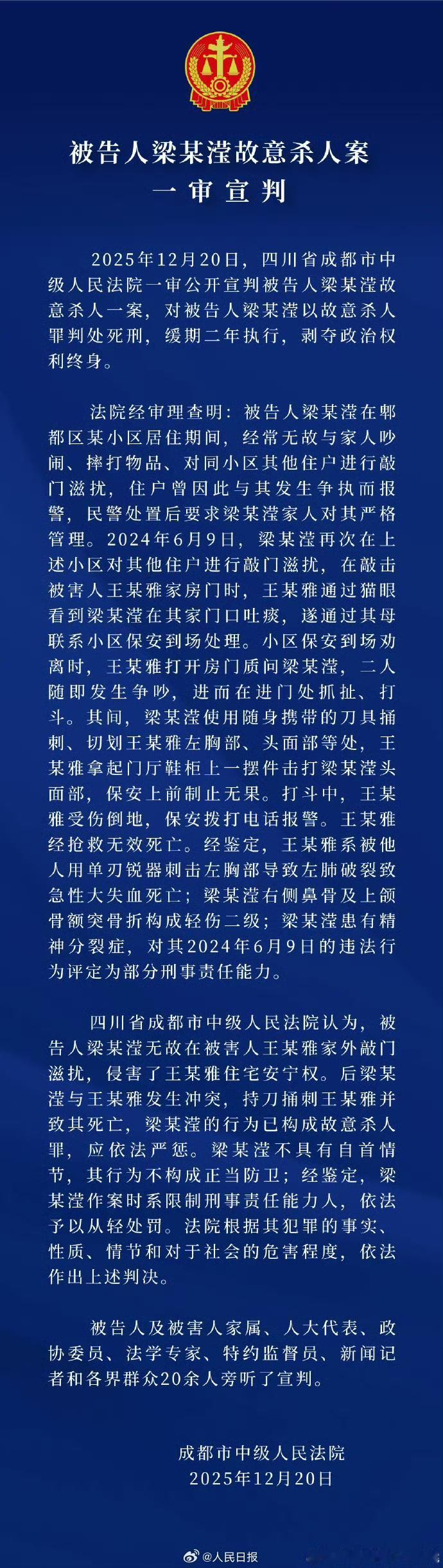 失望,成都女子家门口遇害案判了,法院最终还是承认了那份精神鉴定报告,梁某滢一审判处死刑,缓期二年执行…… 法院认定梁某滢的行为已构成故意杀人罪,不具有自首情节,其行为不构成正当防卫;经鉴定,梁某滢作案时系限制刑事责任能力人,依法予以从轻处罚。 紫雅妈妈等了500多天,从青丝到白发,只想给女儿一个公道,可等来的还是死缓。 她始终不认可那份关键的精神鉴定报告:梁某滢庭审时逻辑清晰,不仅多次打断公诉人问话,还坚称自己是“正当防卫”,甚至嘲讽紫雅“过去优秀证明不了什么”,哪像精神失常的人? 更离谱的是,鉴定人员仅与梁某滢接触2.5小时就下结论,出庭专家都承认没参与实际鉴定,而梁某滢行凶后回家跟母亲说的“今天必须弄死她,不是她死就是我死”,分明是目标明确的预谋,绝非精神失控。 代理律师也早已指出鉴定报告的重大瑕疵,还通过走访找到关键证人,证实梁某滢没有幻听幻视等精神分裂核心症状,可这些质疑终究没改变一审结果。 面对判决,王女士态度决绝:“活着就是为了给女儿维权,不判死刑立即执行,我就上诉到最高法院,还会申请抗诉,绝不放弃。” 大家都在盯着:一句“限制刑事责任能力”,真能成为恶性杀人的“免死金牌”吗?