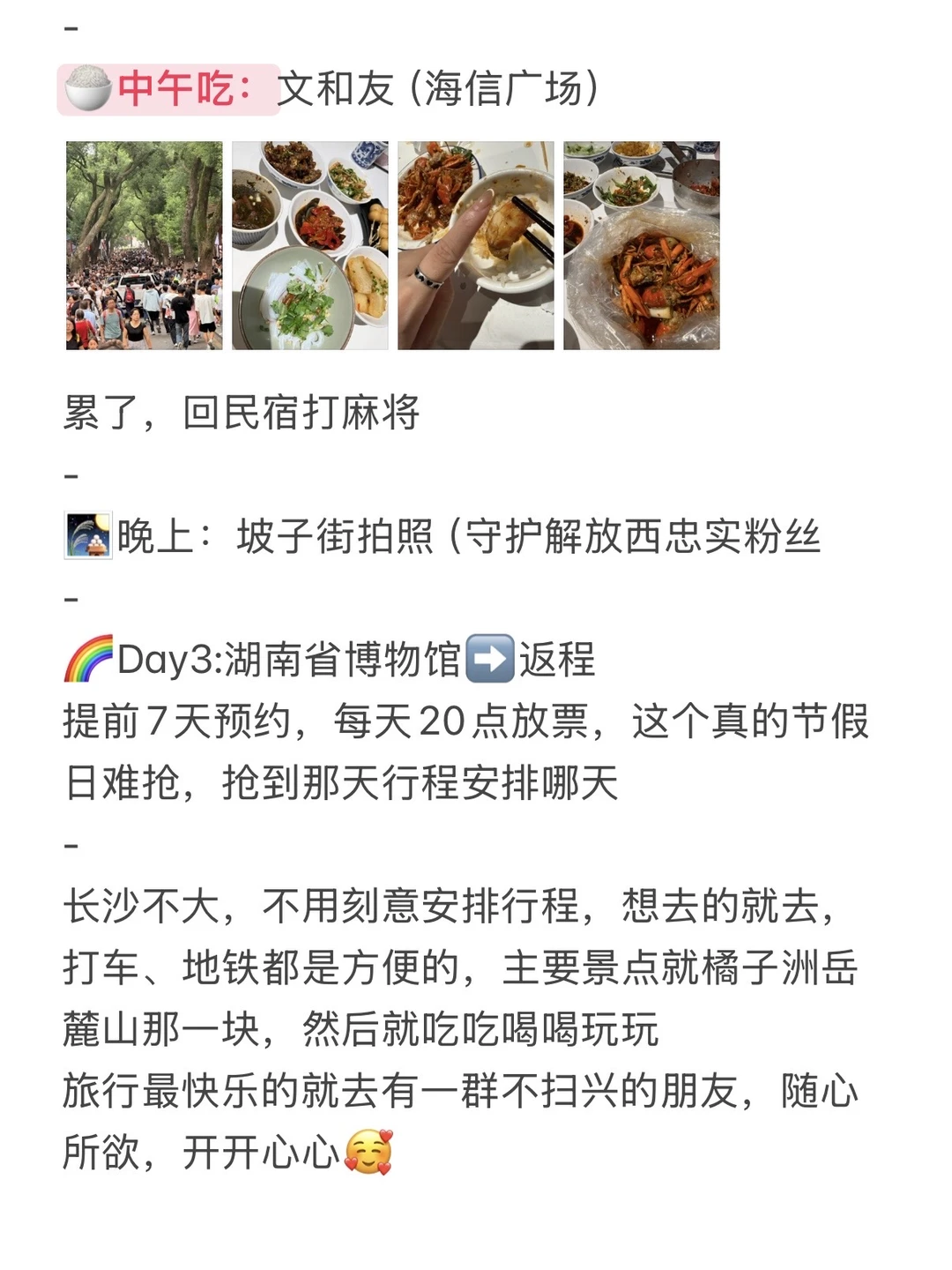 长沙不大,不用刻意安排行程,想去的就去,打车、地铁都是方便的,主要景点就橘子洲岳麓山那一块,然后就吃吃喝喝玩玩