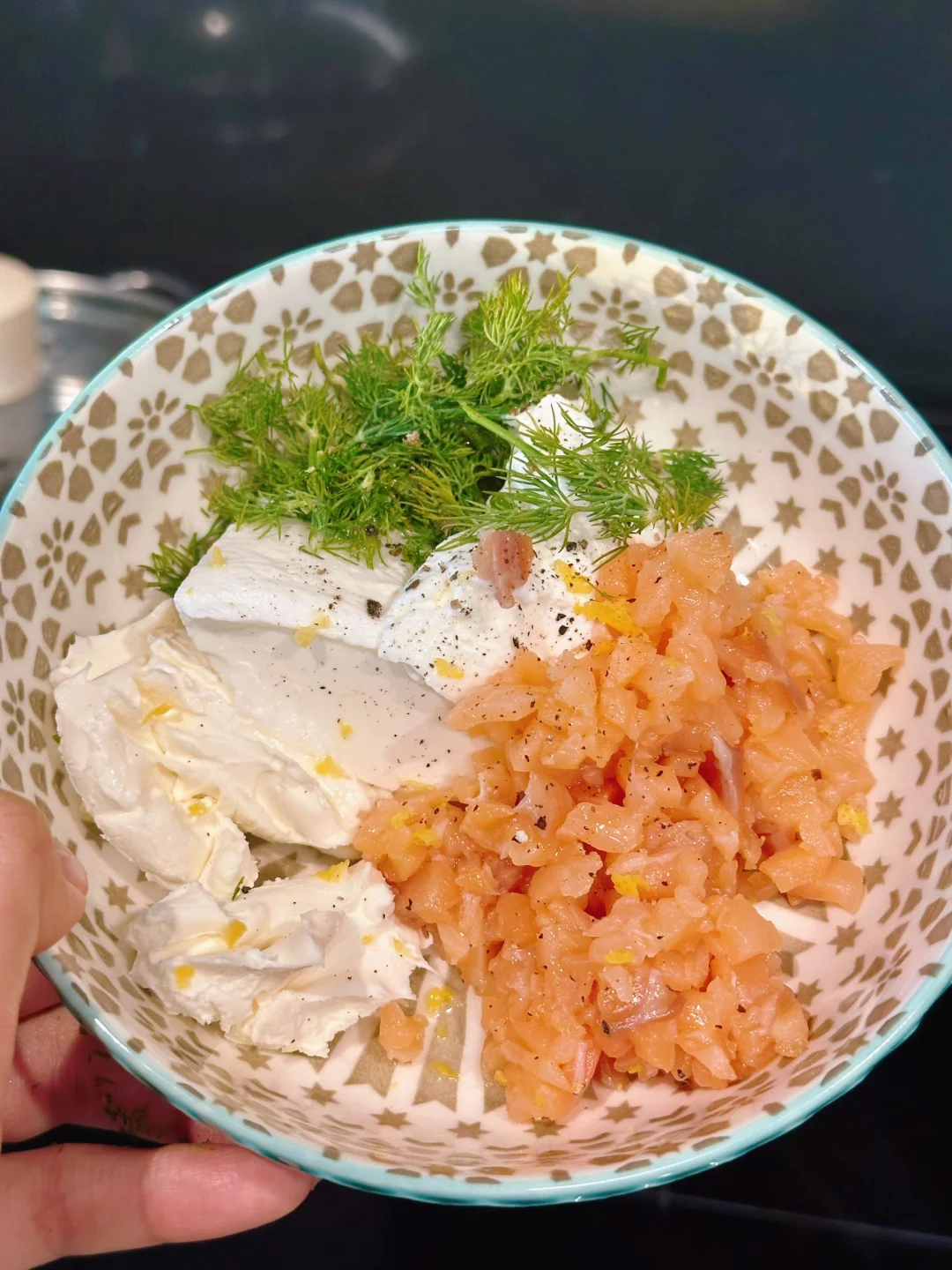 三文鱼,酸奶,奶酪,还有1/3的莳萝混合,撒一点黑胡椒再擦一点柠檬皮屑,搅拌均匀,应该是偏厚重能塑形的质地,如果偏湿,可以加点奶油奶酪或三文鱼、如果偏干,可以加点酸奶或柠檬汁调节;