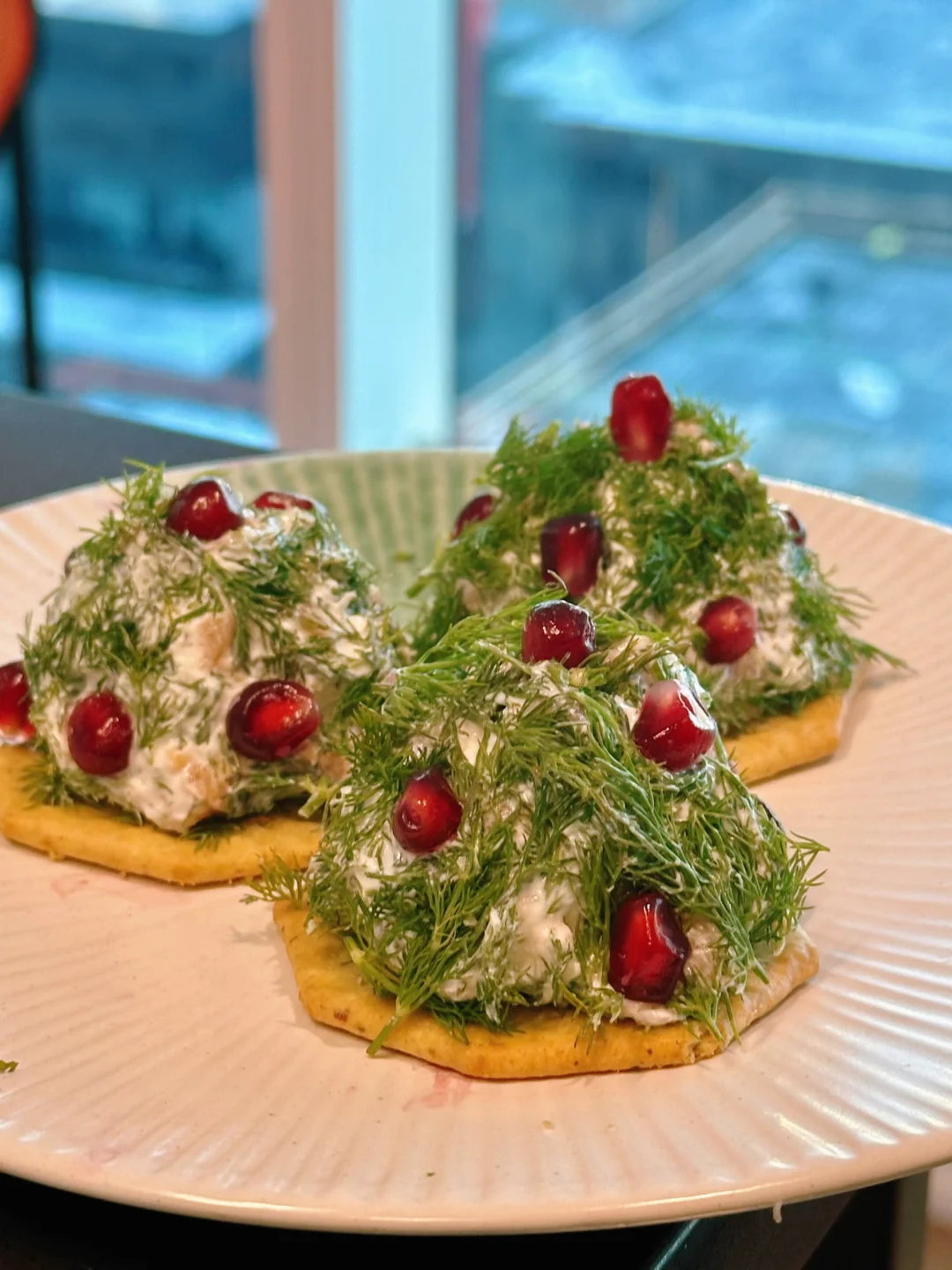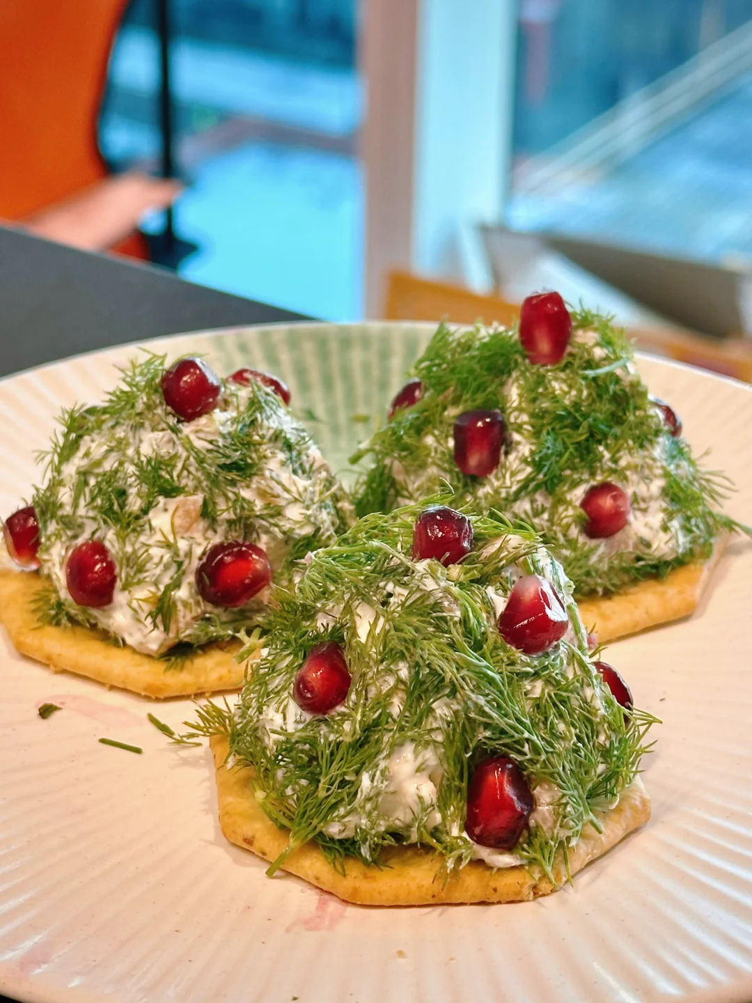 三文鱼配奶酪谁不爱呢?为了更加有节日气氛,在外头裹上了一圈切碎的莳萝。点缀上石榴籽的那一刻,感觉圣诞音乐都要响起来了!