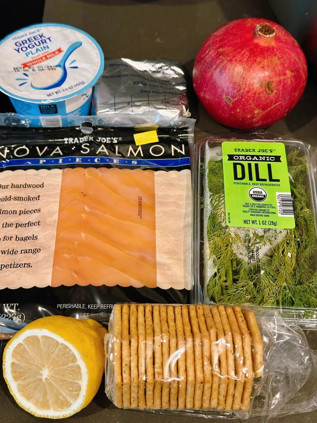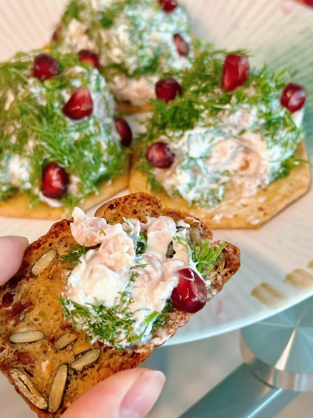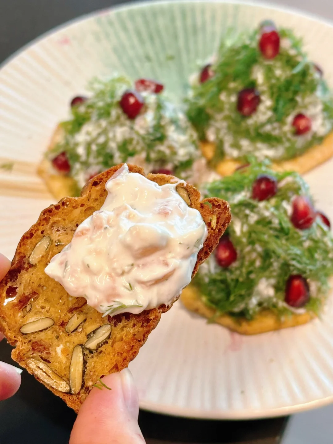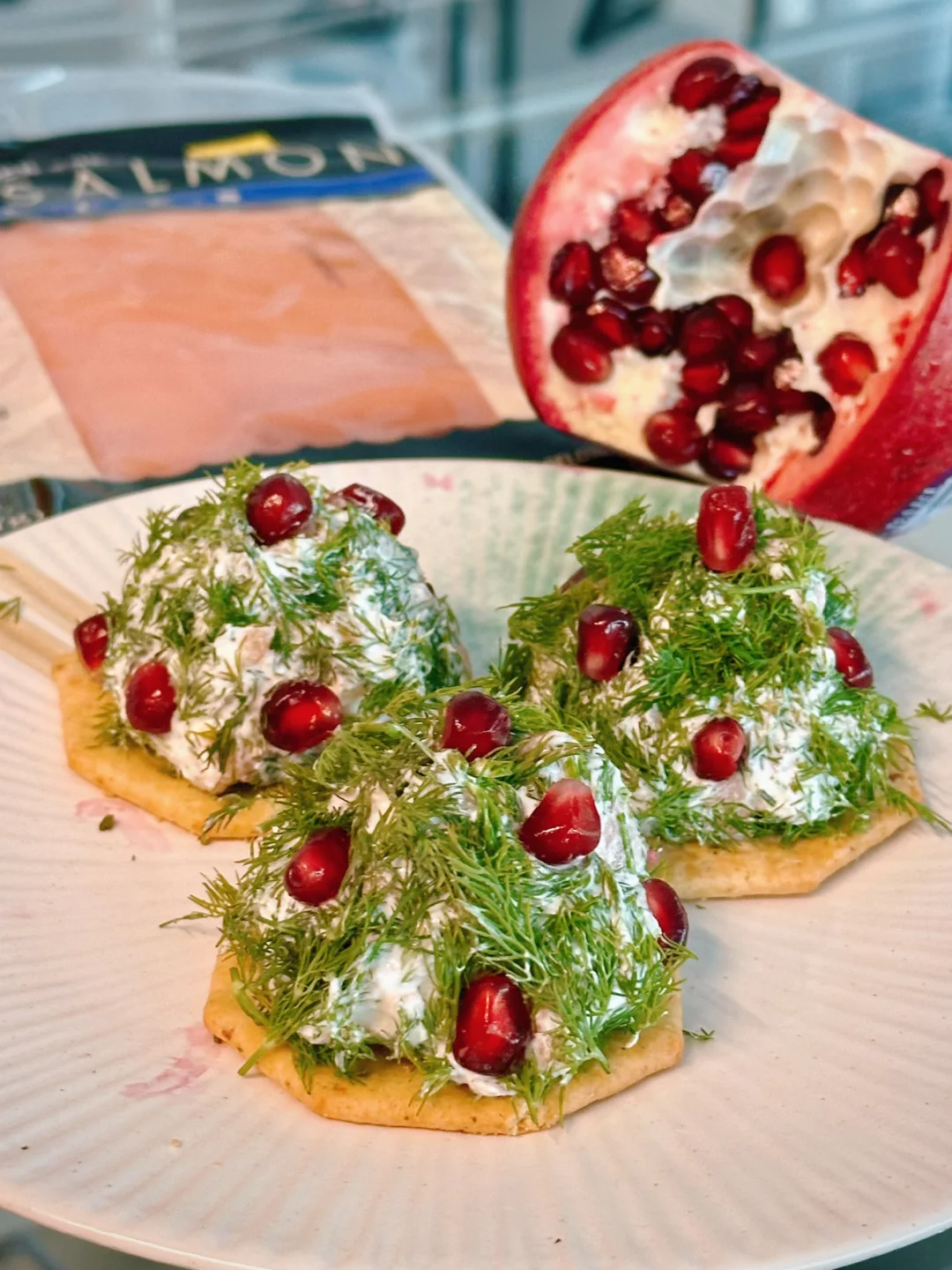 莳萝的清香和三文鱼的烟熏香特别搭,整体咸鲜醇厚,但时不时可以吃到酸甜爆汁的石榴籽,抹在cracker上吃,口感满分!
