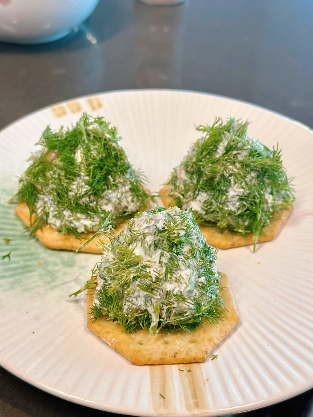奶酪糊分三份,简单塑成一个圆锥型,在莳萝碎上滚一下,然后放在cracker上;