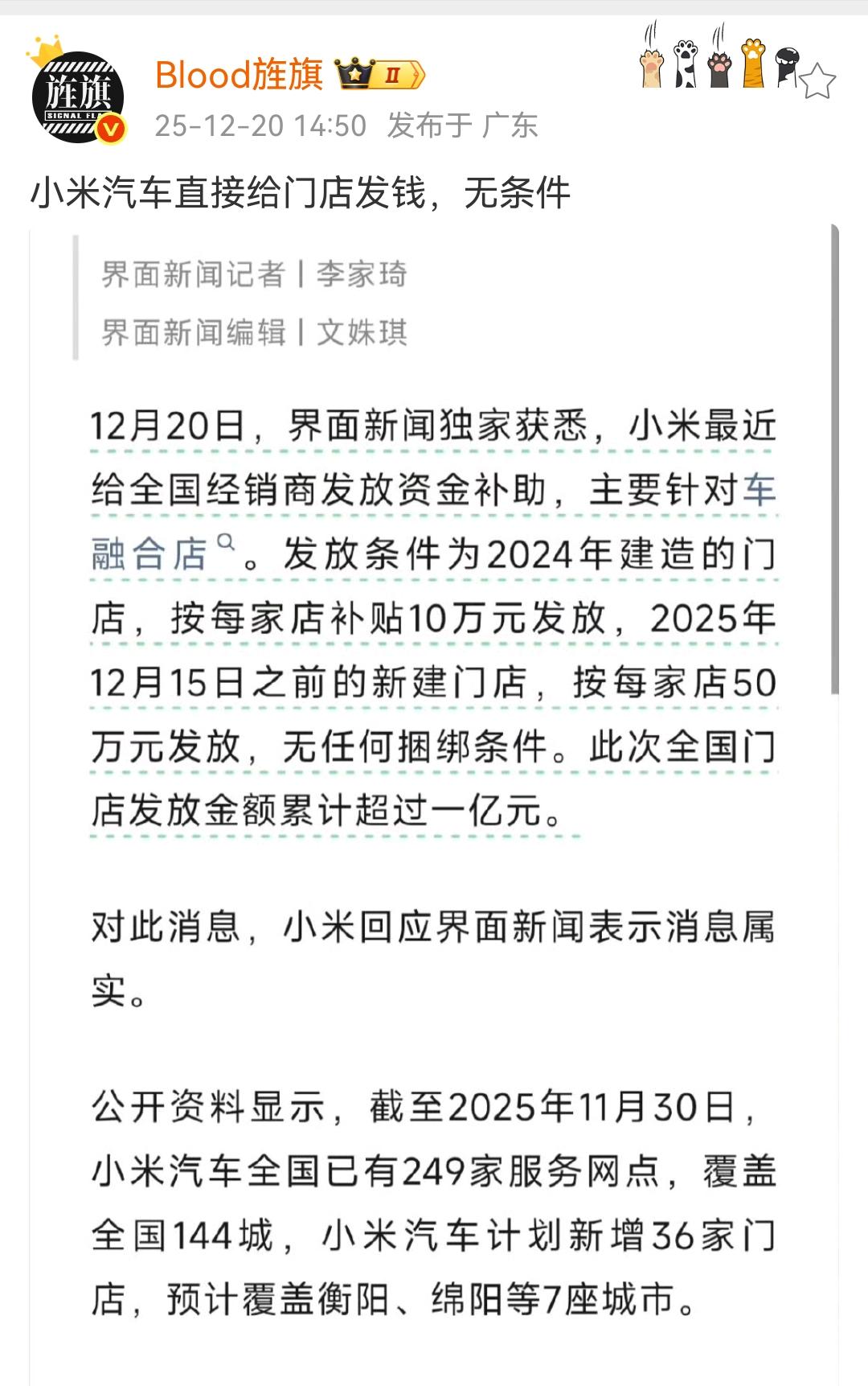 艹老师:小米汽车直接给门店发钱,无条件! 小米汽车给对2024年建造的门店,每个门店10万元的补贴,2025年12月15日之前建造的门店,每个门店给予50万元的补贴! 给经销商发奖金是汽车行业常规的操作,但是往往会增加很多附加条件,比如说车辆的售卖情况,各种考核情况。 像小米这种直接像门店直接发钱,不加任何附加条件的情况还挺少见的。各位是怎么看的?欢迎评论区留言。