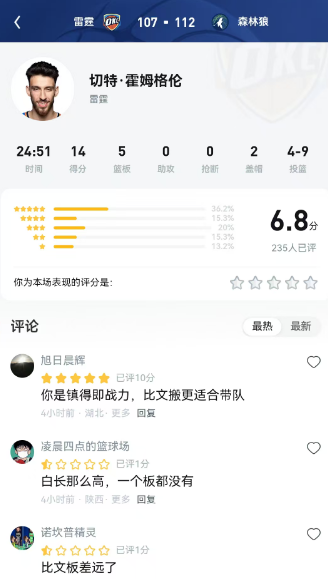 出场24分钟的切特全场得14分,UC直播间的网友说 白长那么高,一个板都没有
