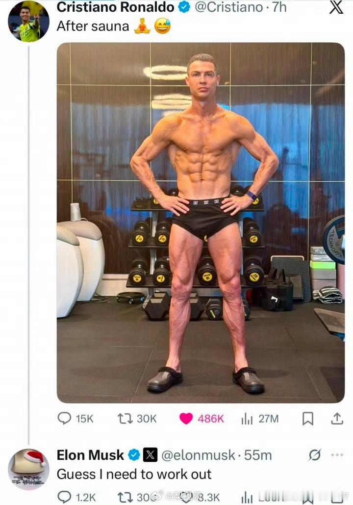 桂哥评:C罗还是这么牛逼,啥事情都要赢啊。===【马斯克回复C罗,马斯克被C罗身材卷到了】12月19日,C罗在个人社交媒体身材照,其魔鬼筋肉再度走红网络,世界首富马斯克也关注并发表了评论。在看到40岁的C罗拥有如同刀刻斧凿般的肌肉后,马斯克在社交媒体上评论道:“我想我需要锻炼一下了”。有好事网友将马斯克的头P到了C罗的身上,令马斯克忍俊不禁。(直播吧)大摩有望牵头SpaceX公开募股