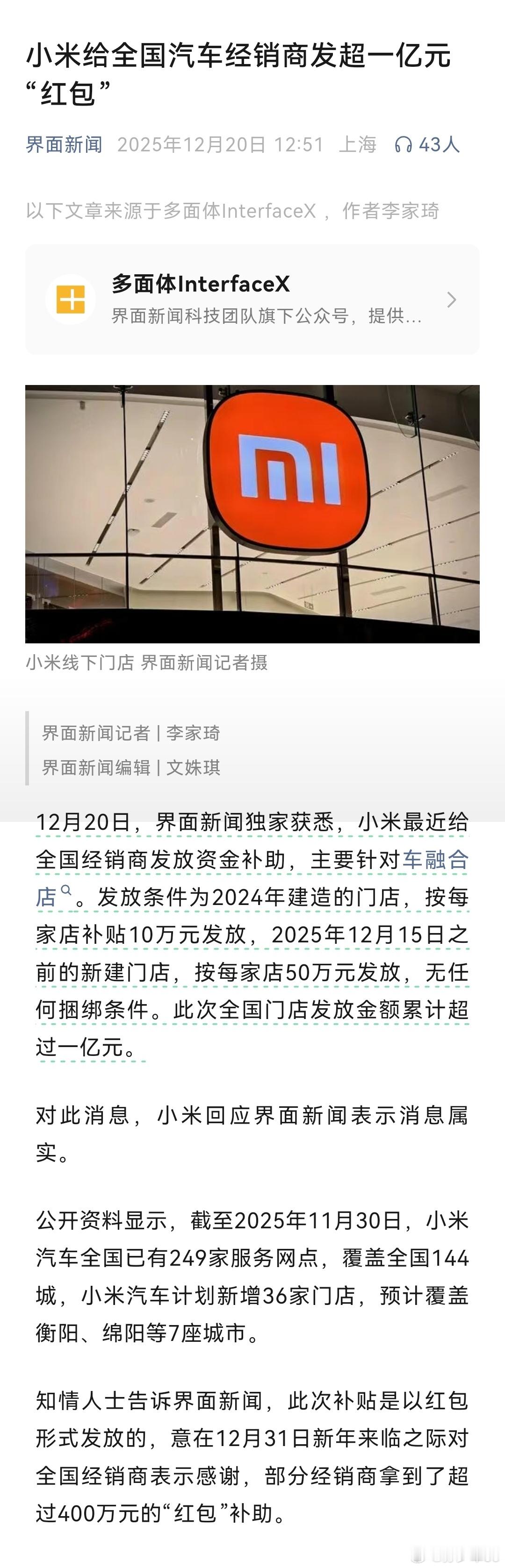 12月20日,界面新闻独家获悉,小米最近给全国经销商发放资金补助,主要针对车融合店。发放条件为2024年建造的门店,按每家店补贴10万元发放,2025年12月15日之前的新建门店,按每家店50万元发放,无任何捆绑条件。此次全国门店发放金额累计超过一亿元。小米给门店发布补贴了新能源汽车