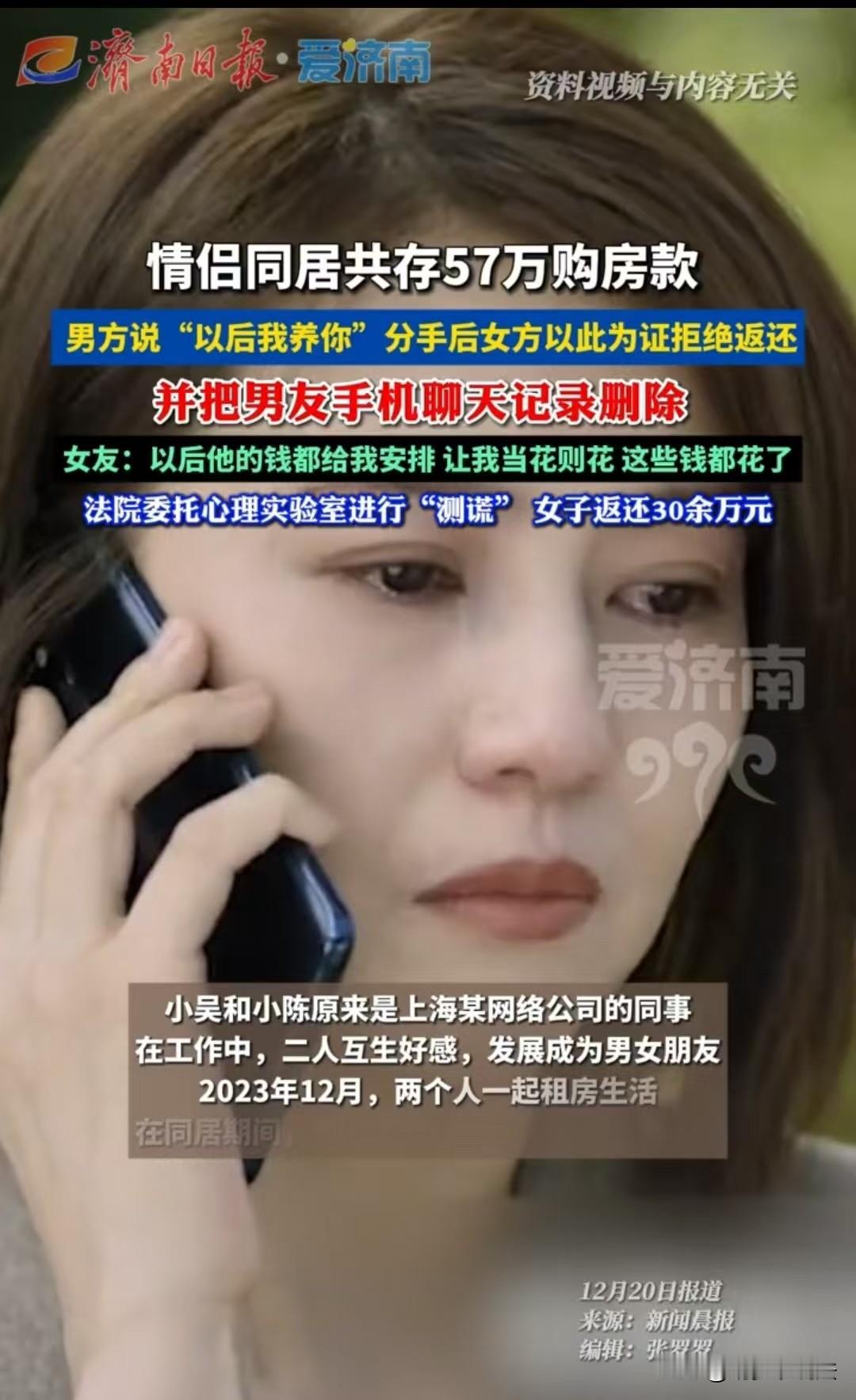 “谁在说谎?12月20日报道,法院使用测谎仪辨真伪”,上海,男子将自己的40多万元存入了和女友的共同账户,女友却将这笔钱转给了自己的父母后离开,还声称这笔钱是男子答应要养自己的赠与费用,而男子表示这是为规划两人以后买房,存入共同账户的钱,既然要分开,女友就该归还,最后,双方说法不一,法院使用了测谎仪,发现女子的说辞有假,因此责令她归还男子30万元,7000元的诉讼费大部分由女子承担。 上海一对情侣同居并计划买房,男方将四十余万元存入双方知晓的账户,感情破裂后,女方将钱转至自己父母名下,并声称这是男方承诺给她的“生活费”。 由于缺乏直接书面证据,双方的说法截然相反,审理过程中,法院依据男方提供的存款记录,提及购房的聊天内容等证据,并结合测谎技术的辅助参考,最终认定这笔钱属于用于共同购房的特定款项,而非一般性生活赠与,判决女方归还其中三十万元。 从法律实务来看,一笔钱被认定为“赠与”并不容易,尤其是大额款项,法律上的赠与需要明确的“无偿给予”的意思表示。 日常中一方承担较多开销,互赠礼物,并不能直接推导出购房款这样的大额财产也属赠与,法院在审查时,会重点考察资金来源,双方日常消费水平,是否有共同目标(如购房,买车)的沟通记录等。 测谎结论不能单独作为定案依据,但它可以在证据链条中作为辅助参考,帮助法官判断当事人陈述的可信度,当双方证据势均力敌,事实真伪难辨时,这类技术手段有时能为理清关键事实提供一个突破口。 法院最终的判决,体现了处理此类纠纷时的综合考量,一方面,核心是要依据证据认定财产的性质和归属,另一方面,也会酌情考虑双方在共同生活期间的实际贡献,比如一方是否承担了更多家庭劳务,或另一方是否有合理的必要支出,以实现利益的相对平衡。 对于共同储蓄购房,优先考虑开设联名账户,确保双方共同监管,即使不开联名户,对于大额转入,也可以通过微信,短信等方式留下“这是咱们攒的买房钱”之类的简单确认记录,这些痕迹在未来可能成为重要的证据。 日常代为支付的购物款,通常被视为情感表达,但一笔定期存入,金额明显超出日常消费水平,且双方曾提及用于特定目标的款项,性质则截然不同,清晰的心理账本和偶尔的文字确认,能避免很多日后麻烦。 同居关系中的财产问题,因缺乏婚姻法的直接调整,更依赖双方的约定和事实证据,随着这种生活方式越来越普遍,相关的法律纠纷也在增多。 通过这类案例可以看到,法律并非对同居关系完全不加保护,而是更侧重于对清晰事实和财产来源的审查。 人心可畏,防人之心不可无。 “这判决没毛病,空口白牙说‘我养你’,几十万就成你的了,法院讲证据,测谎仪也佐证了,这钱就是有特定用途的,不是白给的。” “给所有恋爱中的人提了个醒,‘谈钱不伤感情,糊涂账才最伤感情’,大额资金往来,哪怕是情侣,留个凭证,说清楚用途太有必要了,爱情可以冲动,但钱包要清醒。” “支持男方,辛辛苦苦攒的买房钱,差点就打水漂了,这不仅仅是钱的问题,是信任被彻底践踏了。” “虽然女方的做法肯定不对,但大家有没有想过,他们同居那么久,女方的青春和付出难道就一文不值,法院最后判返还30万而不是全部,是不是也考虑了这部分因素,‘法律是底线,但人情是复杂的’。” “这件事里,最讽刺的就是那个共同账户,名字是‘共同’,实际上成了女方的‘私人保险箱’,所以啊,‘共同’两个字,关键得看管钱的人和心在不在一条线上’。” “测谎仪都上了,说明事实争议有多大,感情好的时候啥都好说,一旦撕破脸,曾经的美好都能变成扎向对方的刀。挺唏嘘的。” “长知识了,原来民事案件里也能用测谎结果作为辅助参考,不过法院也明确说了,这不是唯一证据,得结合其他证据链,‘这说明什么,说明平时留好聊天记录,转账备注有多重要。’” “这个案子很有典型意义,它明确了,以结婚为目的的大额转账,如果婚没结成,是可以主张返还的,这跟‘彩礼’的性质有点像,不是普通的赠与。” “诉讼费大部分由败诉方(女方)承担,这也是个重要信号,谁无理取闹,虚假陈述,谁就要承担更高的法律成本。” 你会选择“绝对信任,不分你我”,还是会“先小人后君子,留下必要凭证”呢? 信源:济南日报