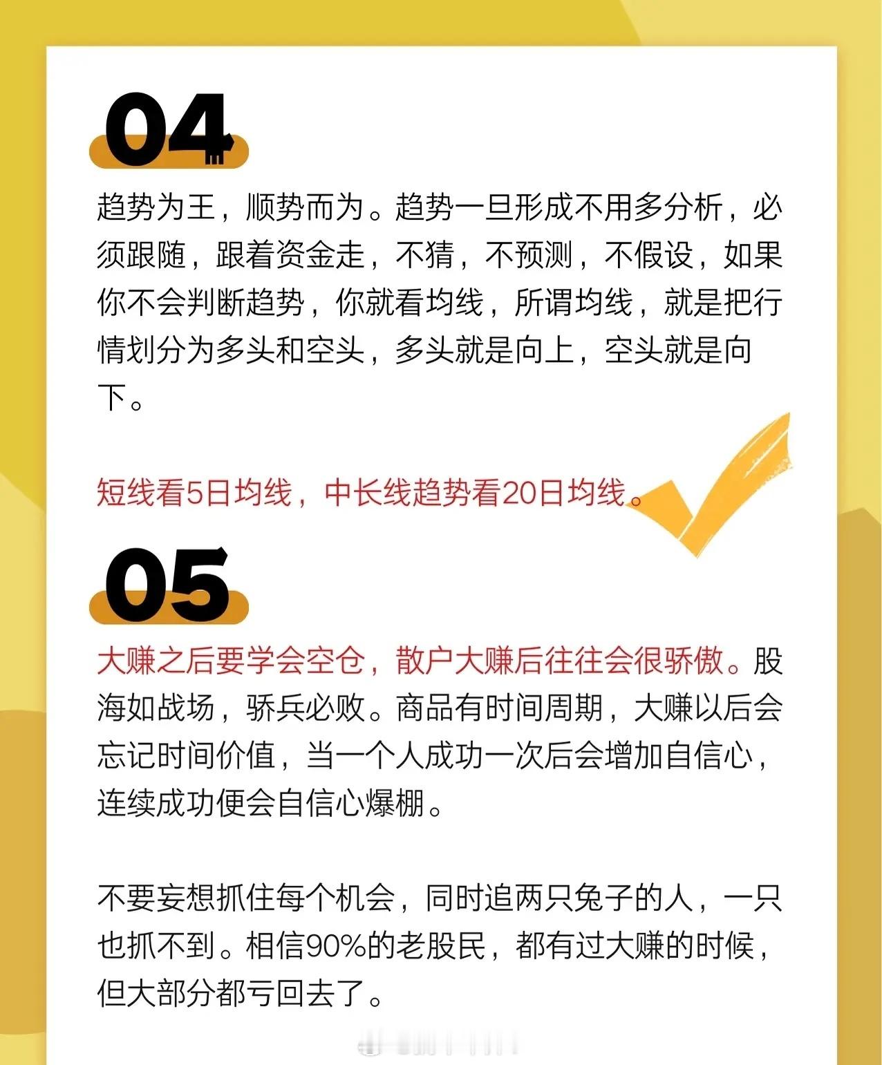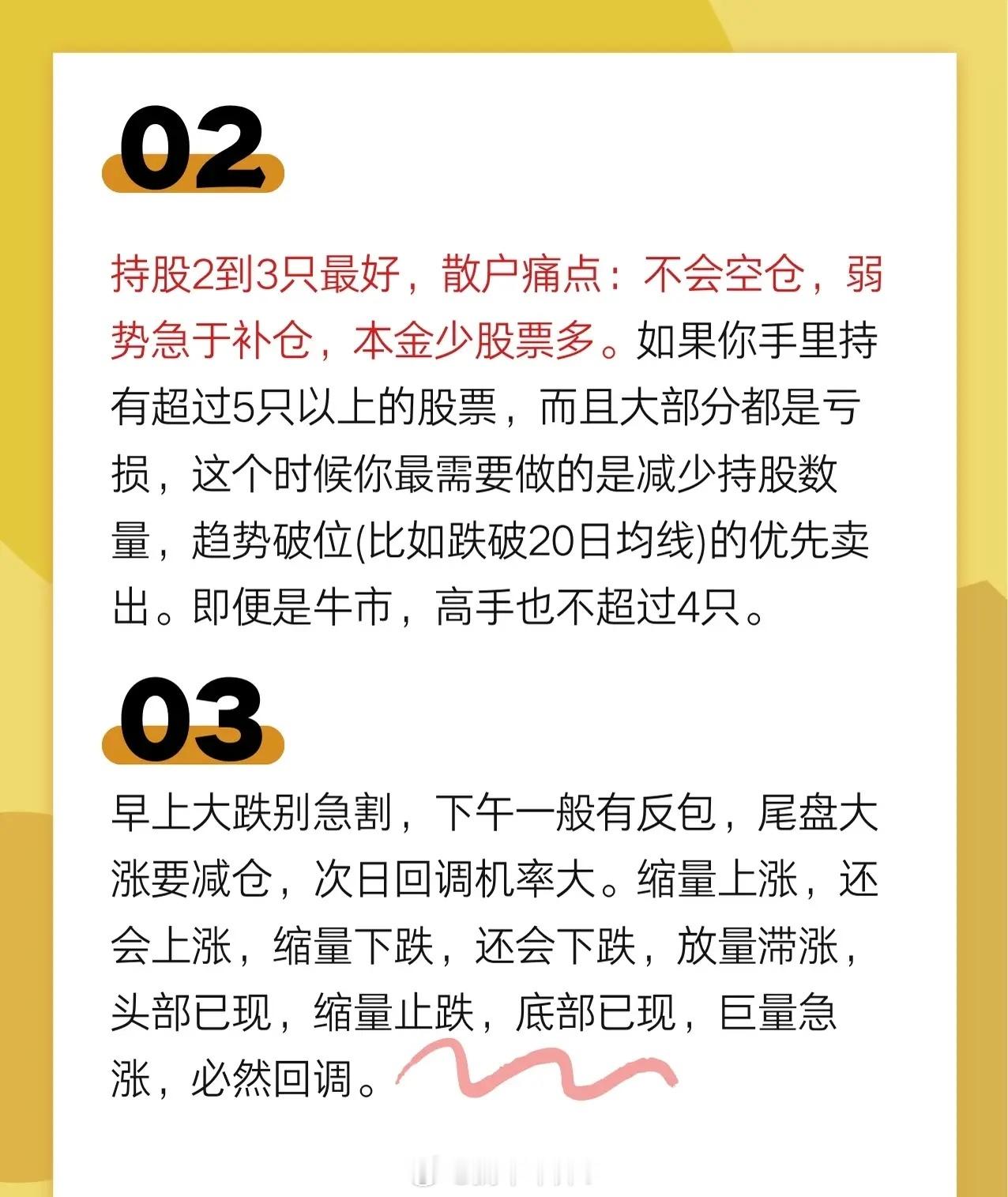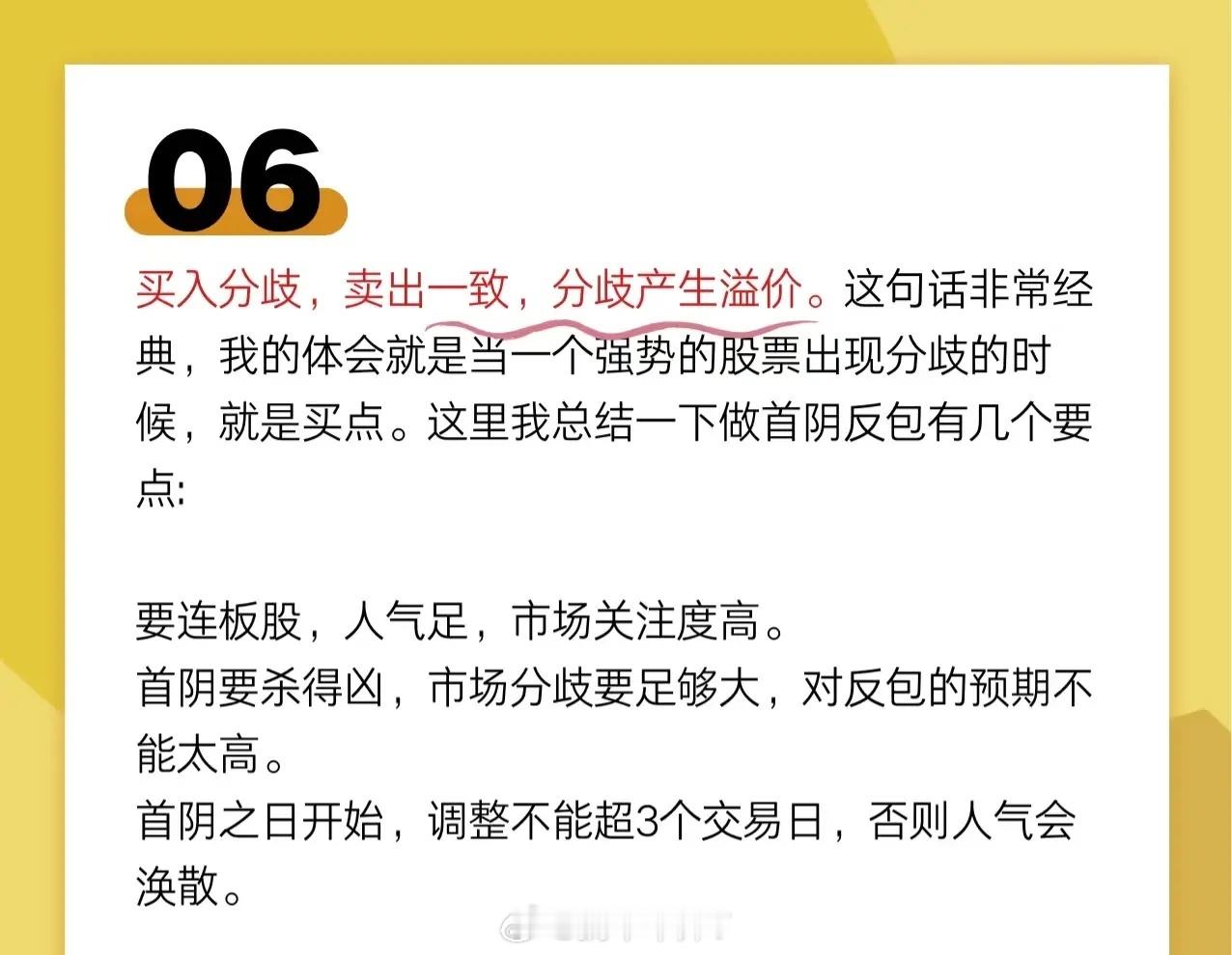 “炒股养家6大铁律”整理如下:第一条,指出散户通病:亏损时死扛,稍有盈利便卖出,只看账户盈亏比而不关注趋势和成交量,导致亏损无限扩大、盈利却有限。建议反向操作——盈利时死拿、小幅亏损就割肉。还举例说明,若总设定止盈10%、止损5%,即便操作100次胜率仅50%,最终也能翻8倍,凸显复利的力量。第二条,聚焦散户另一痛点:不会空仓,弱势时急于补仓,本金少却持有多只股票。建议持股以2-3只为佳,若持有超5只且多数亏损,应减少数量,优先卖出趋势破位(如跌破20日均线)的股票;即便是牛市,高手持股通常也不超过4只。第三条,分享日内操作策略:早上大跌别急着割肉,下午一般会有反包;尾盘大涨需减仓,次日回调概率较大。同时列举量价关系规律:缩量上涨还会涨,缩量下跌还会跌,放量滞涨意味着头部已现,缩量止跌代表底部已现,巨量急涨必然会回调。第四条,强调趋势为王、顺势而为的理念,认为趋势形成后应跟随资金方向,不猜测、不预测、不假设;若不会判断趋势,可通过均线辅助——短线看5日均线,中长线看20日均线区分多头(向上)与空头(向下)。此外提到投资心态:大赚后要学会空仓,散户大赚后易骄傲致败,勿妄想抓住每个机会(如同追两只兔子终将一无所获),不少老股民都有过大赚后亏回去的经历。第五条,围绕“大赚后空仓”的心态警示,戳中许多投资者的痛点。第六条,总结经典策略“买入分歧,卖出一致,分歧产生溢价”,作者体会是强势股出现分歧时是买点,并列出做首阴反包的三要点:一是选连板股,要求人气足、市场关注度高;二是首阴需杀得凶,市场分歧要足够大,对反包的预期不能过高;三是首阴之日起调整不能超过3个交易日,否则人气会涣散。