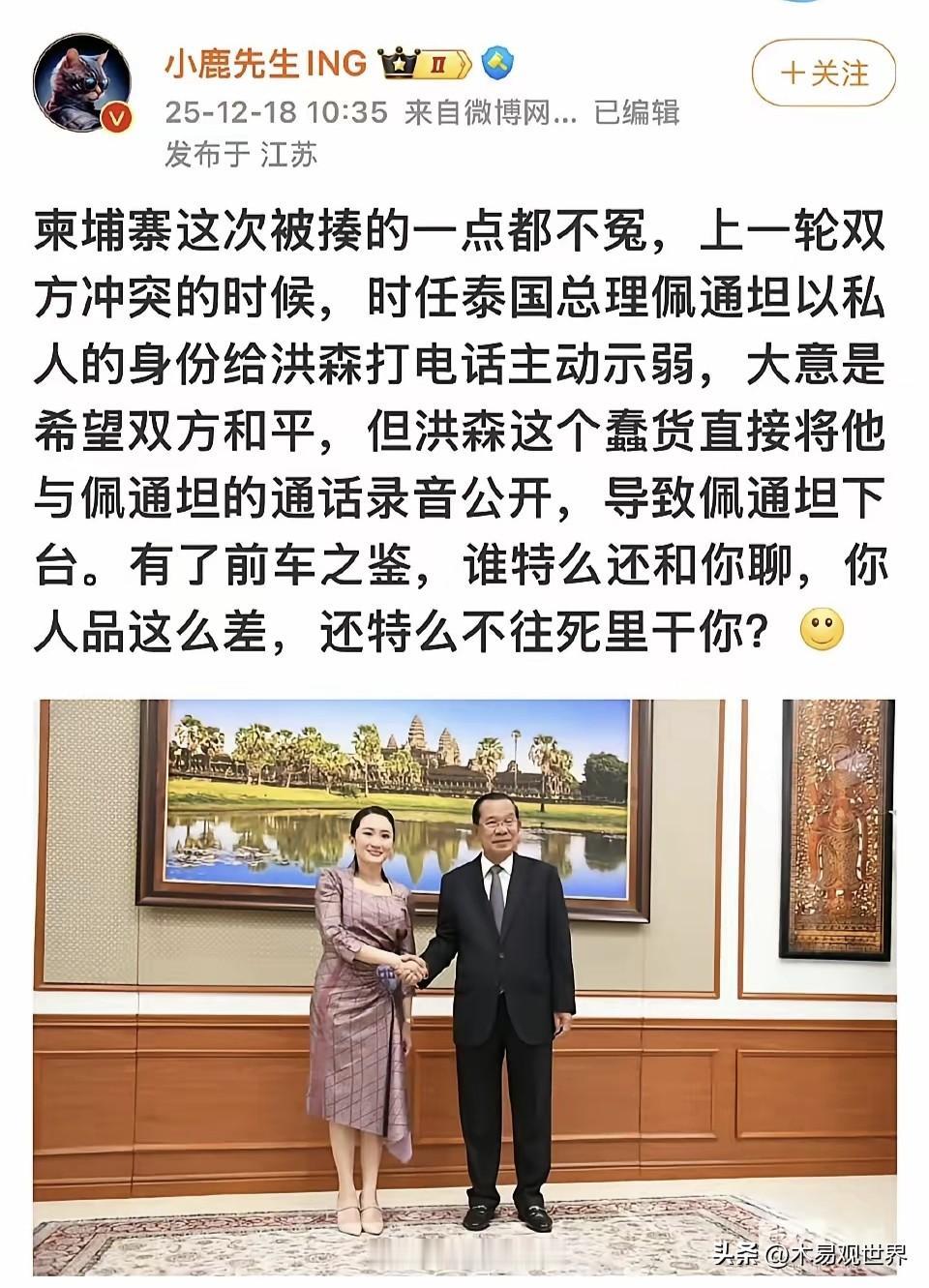 有博主认为洪森还保留着严重的军阀思维。 毕竟当初泰柬第一轮传统之时,泰国当时女总理佩通坦给了个台阶让洪森下,结果人家不但没了解善意甚至公开电话内容。 如今现在泰国总理是少数派又是临时内阁,自然需要做出一些成绩出来,才有了现在执意要把柬埔寨一撸到底的气势。 对于洪氏家族而言,如何改掉军阀思维,审时度势配合湄公河大开发,发展经济改善民生才是王道。
