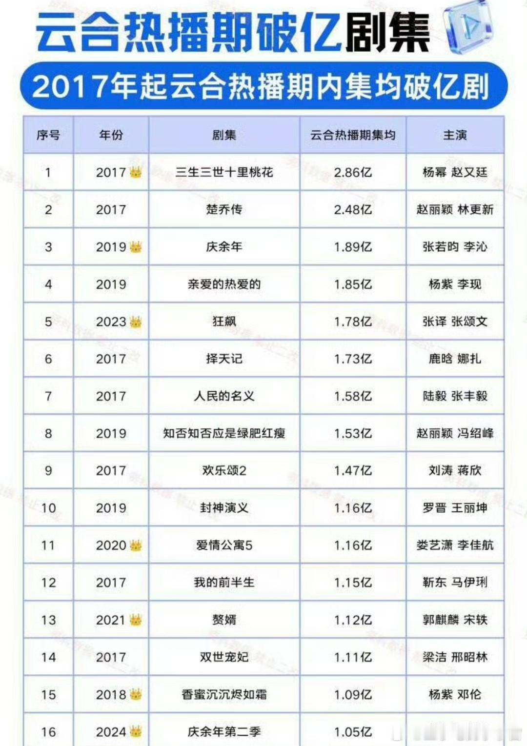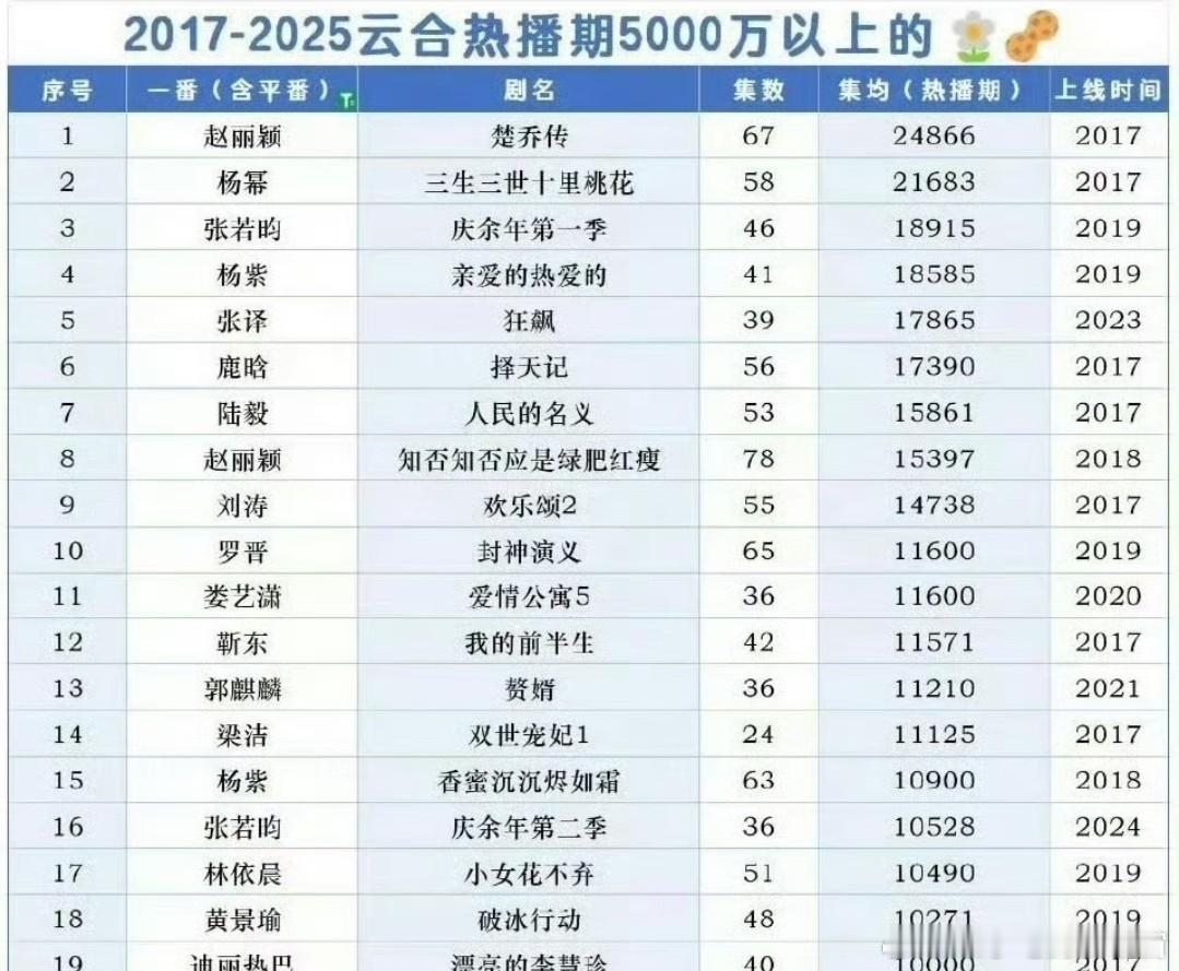 谁能想到,两部2017年播出的剧,现在居然跑出来抢云合史冠,还被推上了热搜,这个就有点搞笑了。这两部剧分别是杨幂的《三生三世》和赵丽颖的《楚乔传》,前者口碑6.6分,后者口碑5.4分。如果单从数据来看,当年播出时就有过一次统计,那是统计2017年所有剧集的有效播放,《三生三世》排在《楚乔传》前面。2025年又统计过一次均集破亿俱乐部里的电视剧排名,《三生三世》有效播放均集破5亿,《楚乔传》有效播放均集破3.5亿,这里也能看出谁高点。所以,无论从口碑还是相隔数年的两次数据统计,杨幂的《三生三世》都要超过赵丽颖的《楚乔传》,这其实真没啥争议。不过,云合数据也仅仅是个参考,当年无论《三生三世》还是《楚乔传》,播出的时候都特别火热,观众讨论积极性也很高。杨幂和赵丽颖被迫竞争这么多年了,基本都拥有了自己的地位。尤其是杨幂,凭借《生万物》在今年转型成功,而赵丽颖今年就有点糟糕,电视剧方面还好,电影方面则连续扑街。