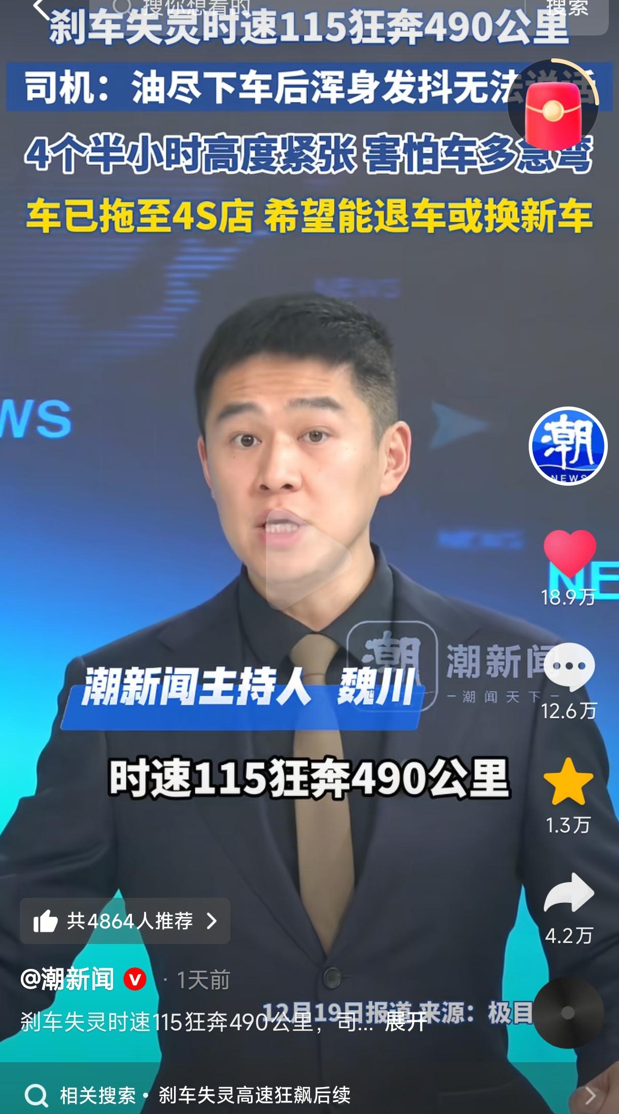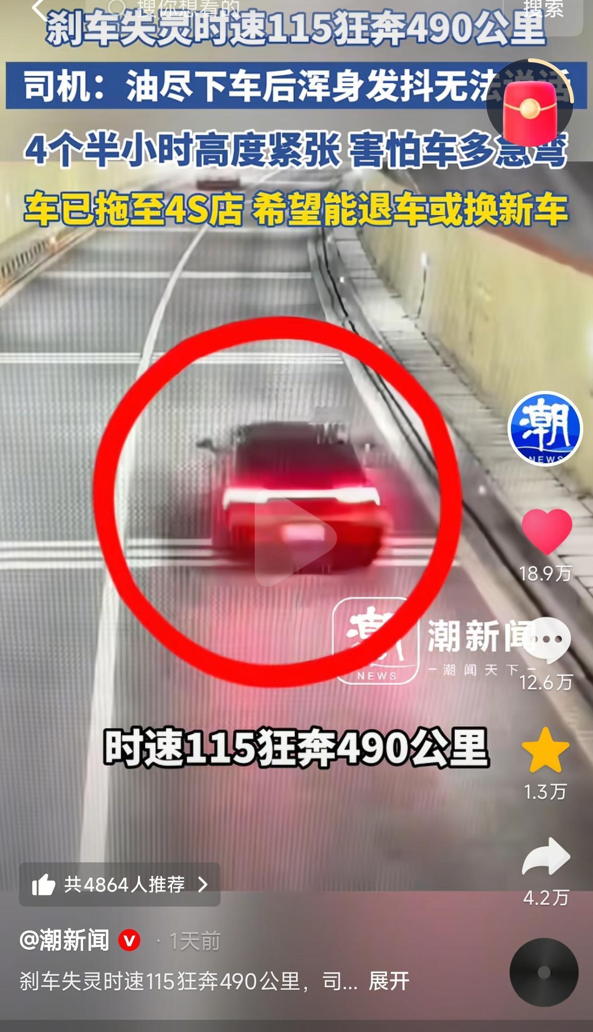 “生死狂奔!”一位小伙刹车失灵,吓得以115公里时速狂奔490公里,直到油耗尽才停下了车,下车后,小伙浑身发抖,无法说话。途中小伙强压慌乱报警,又联系4S店求助,之后交警开道,4S店却无能为力,只得狂奔4个半小时让车油耗尽才停下了车。这一经历让小伙后怕不已,之后将车拖到4S店,希望退车或换新车。 (来源:潮新闻、人民日报) 12月17日,23岁小马与女伴驾车从兰州回宁夏,没想到,定速115公里后,车子突发故障,刹车失灵了,定速巡航又关不掉。 突如其来的故障,令小伙十分慌乱,那可是115公里的高速行车啊,路上还有那么多车,后果难以想象,稍有不慎就会丧命! 但小伙内心还是十分强大的,他先让自己冷静下来,之后报警,联系4S店寻求紧急制动的方法等,但4S店却表示无能为力,让小伙独自承担生死风险,太无语了。 之后小伙打起精神狂奔,他这种方法可圈可点,先是打开双闪提醒,遇前面有慢车就长按喇叭,遇超车困难就走应急车道强超。 直到看到交警赶来开道,小伙这才感到心安。 不得不说,交警的执行力真是杠杠滴,先是询问小伙的车速,又问小伙有没有跟4S店寻求解决办法,之后几辆警车便在小伙前面开道,给予小伙满满的安全感。 这一刻,“永远要相信人民警察”再次被具象化了。 就这样,几辆警车陪着小马在高速路上风驰电掣的狂奔,如此生死狂奔,看得人心都提到了嗓子眼,同时又热血沸腾! 最终,小伙狂奔了490公里,耗费了4个半小时,直至车油耗尽了才停下了车,结束了这一场“生死狂奔”之行。 而一下车,他和女伴两人浑身都还在发抖,双腿发软,站都无法站立,被交警扶上了救援车,随后将两人安全送回。 这段经历,让小马心有余悸,当时同行女伴也被吓哭,这一经历怕是让两人终身都难忘了。 对于那辆事故车,小马怕是再也不敢开了吧,很可能会要求4S店退车或者换新车了。 小伙在刹车失灵的情况下,采取“靠油耗尽避险”的方法停车有一定的借鉴性,但也有偶然性,同时说明刹车系统的设计缺陷与质量问题。 还有4S店在接到求助后却无法提供帮助,这是典型的应急处置失责。刹车失灵可是危及生命的汽车故障,车企与4S店都应配备专业的应急救援方案,如远程指导车辆减速、设置沿途维修站设置避险设施等,而不是让车主独自承担生死风险,这种不作为太寒消费者的心,也违背了应尽的安全保障义务。 事后小伙要求退换车也符合条件,车企不能拒绝,反而还要主动承担责任,这是对所有同款车主的负责。