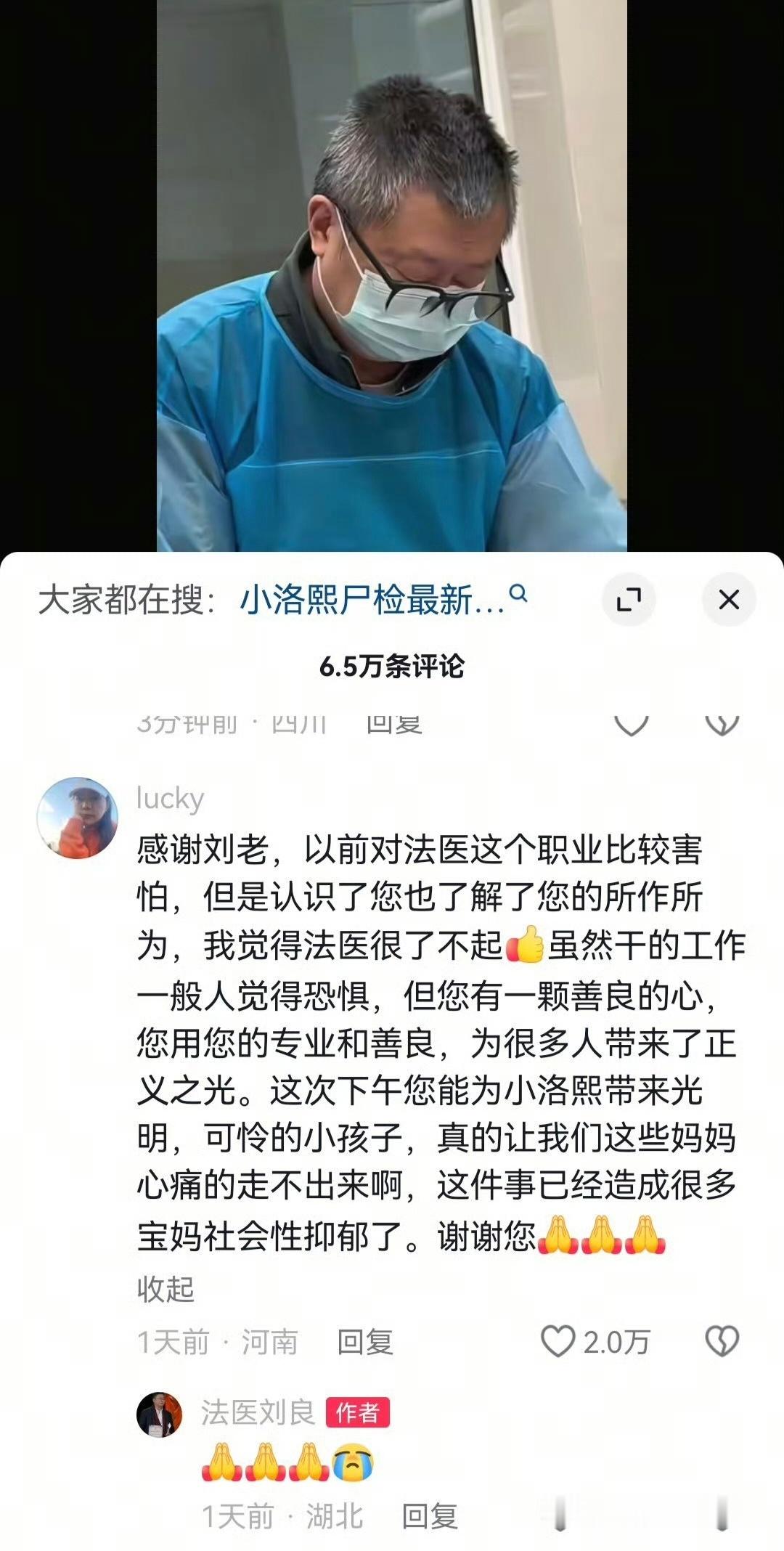 法医刘良凌晨发视频配文星星亮了 感谢刘老!您勇敢地在社交媒体表达了正义之光,您为死者言的使命感让人敬佩而感动!您的勇敢和伟大,照亮了在另外一个世界的小洛熙。希望造成这次医疗事故的人能付出代价,得到最严厉的惩罚!