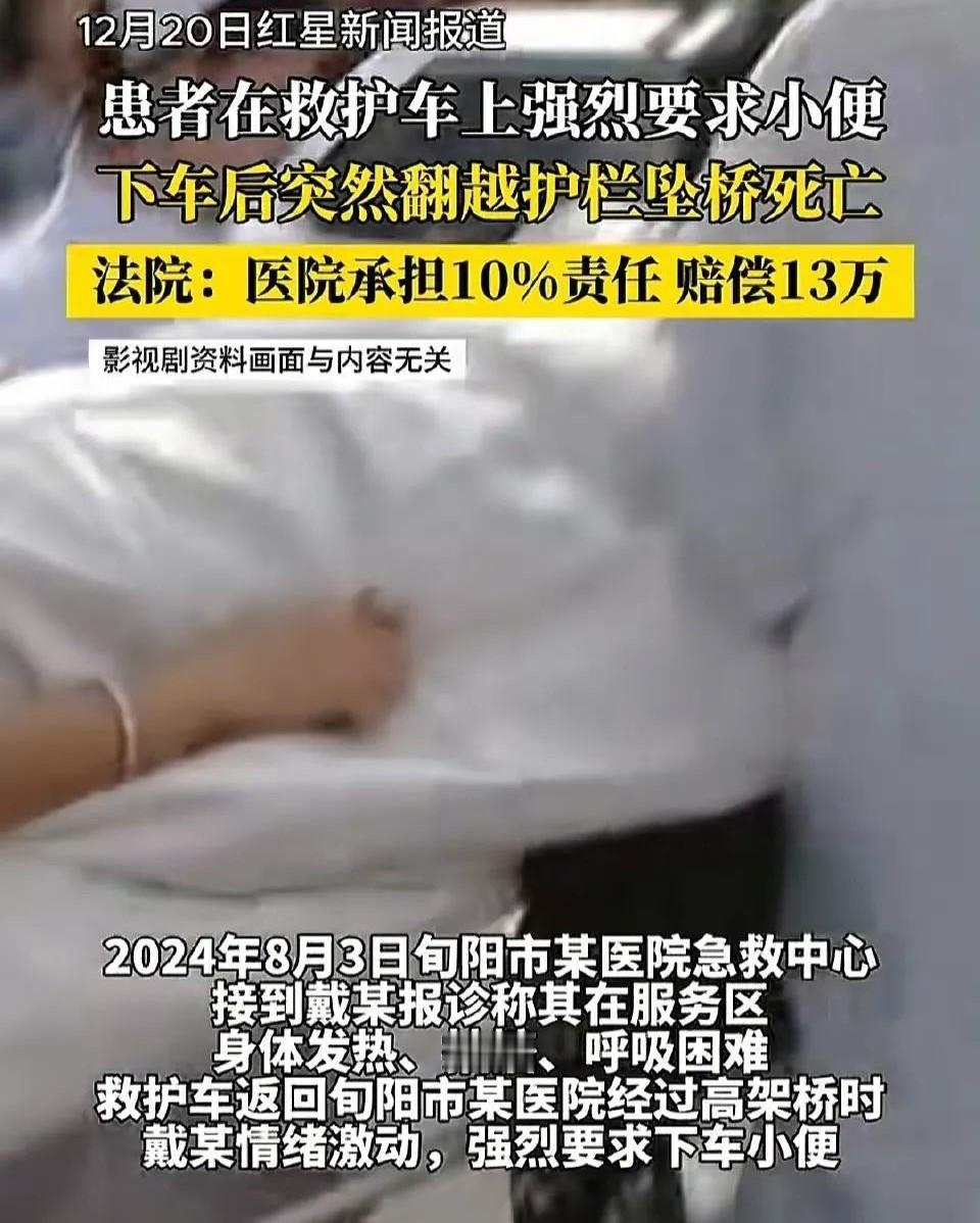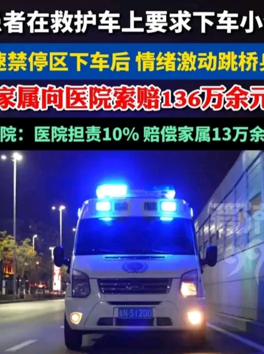 救护车停禁停区,患者下车小便后坠桥!13万赔偿冤不冤? 深夜高速上,救护车警灯正急闪——货车司机戴某高烧抽搐、呼吸困难,刚被120接上送往医院,却突然情绪激动喊着要下车小便。司机把车停在高架桥禁停路段,谁料戴某下车后突然变向,翻越高115厘米的护栏坠桥,当晚被找到时已无生命体征 。 一场急救变悲剧,家属直接把医院告上法庭,索赔136万余元,认为医院深夜在禁停区停车,还放任神志不清的患者独自下车,才酿成大祸。但医院喊冤,说监控显示戴某在车上神志清醒、还在打电话,甚至攻击医护,跳桥是无法预见的自杀行为。 法院的判决让不少人热议:戴某坠亡是自己的行为导致,和急救没有直接关系,但医院作为专业机构,没尽到最高安全义务——禁停区违规停车,患者情绪激动还没紧紧陪护,存在明显过错。最终医院被判担责10%,赔偿13万余元。 其实急救里的两难很常见,医护要救死扶伤,也得守住安全底线。可换个角度想,要是当时没在禁停区停车,或者陪护更紧密,这场悲剧会不会避免? 13万赔偿到底是警示还是委屈?如果是你遇到这种情况,会同意停车吗?评论区说说你的看法,下期聊聊急救中那些难平衡的安全边界。