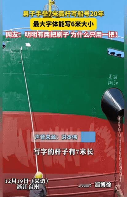 “高手在民间!”浙江一男子手举7米高杆写船号,这一写就是20年时间,最大字体能写6米大小,有人问这么长的杆子,怎样把字写起来的?男子回答说:只要功夫深,铁杵也能磨成针,还有就是眼力、臂力和控制力。网友:明明有两把刷子, 为什么只用一把? 这难度不是一般的大。离这么远,人站的角度这么低,要想控制好每个字每一笔画的比例大小,这功夫是怎么练就的? 而且,这杆子可不是一般的长,足足 7 米,光是举在手里就沉得很,别说写字了!可大哥一举就是 20 年,写出的字最大能有 6 米见方,笔锋刚劲、比例匀称,路过的人看了都忍不住停下脚步,啧啧称赞:“这手艺绝了,真是高手在民间!” 这么多年下来,大哥的手艺练得炉火纯青。他写过最大的字有 6 米见方,就算客户要求写更大的字,他也能轻松应对。 有人劝他,现在有机器喷字,又快又省事,干嘛还这么辛苦地手工写?大哥摇摇头说,机器喷出来的字看着整齐,却没灵气,少了手工的温度。 手工写的船号,每一笔都带着劲儿,能跟着船走一辈子,这是老祖宗传下来的手艺,得守住。 有网友说:“20 年只干一件事,把简单的动作练成绝活,这才是真匠心! 机器永远替代不了手工的温度!大哥举的不是 7 米杆子,是对手艺的坚守,这才是真正的高手在民间! 现在社会节奏快,很多人都想着走捷径、求速成,干一份工作没几天就想跳槽,学一门手艺没入门就想放弃。可大哥用 20 年证明,真正的本事从来不是一蹴而就的,“只要功夫深,铁杵磨成针”,把一件小事做到极致,就是了不起的成就。 机器喷字确实高效,但少了手工创作的独特性和温度;而大哥写的船号,每一笔都凝聚着他的心血,承载着船厂的记忆,甚至能成为船的 “灵魂印记”。 像大哥这样的民间高手,让我们看到了传统手艺的生命力。 最后也问问:在快节奏的当下,你愿意为一件事、一门手艺坚持十年甚至二十年吗?