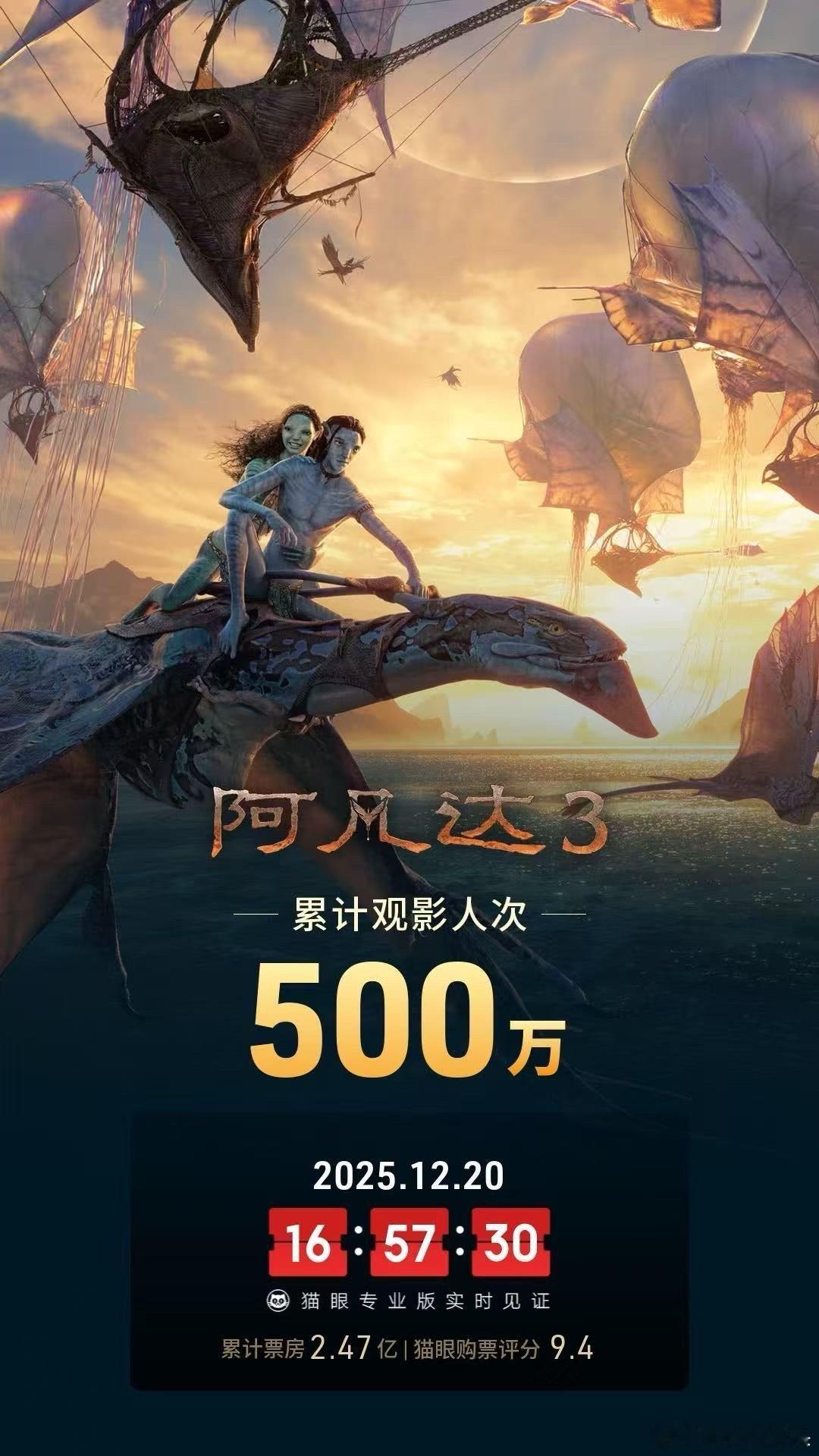 啊凡达从来不会让人失望,火与烬依然好看,热度也很高上映不到两天观看人数已经破500万,圣诞节能突破多少票房我们拭目以待
