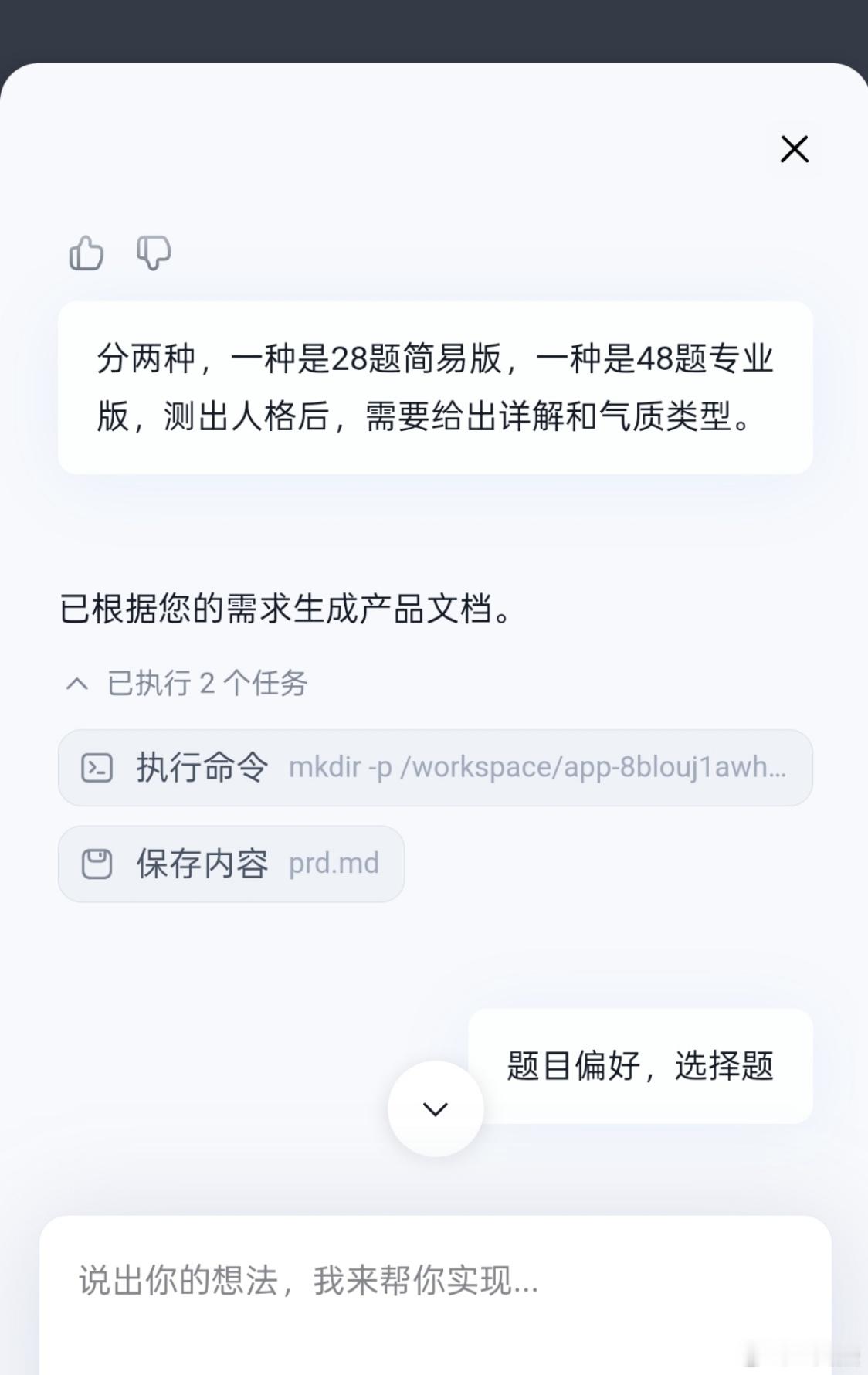 百度秒哒这款AI软件确实挺好用的,这两天用它做了三款软件,分别是MBTI题库、眉型小程序和图片生成小程序,都能正常运行。操作起来也很简单,你只需要提出自己的想法,比如我说:“帮我做一个MBTI题库,测人格”它会根据这款软件,提出问卷,像↓↓1希望这个MBTI测试包含多少道题目?2有特定的题目偏好吗?比如是选择题形式,还是陈述句让测试者选择同意或不同意?3是否需要在测试结束后显示详细的人格分析和解读?除了它提出的,你也可以添加自己想要的功能,生成出来不满意的地方还可以进行修改编辑,手机上就能操作,但在【发布】这一步会因为缺少翻译产出,导致软件无法正常发布。想发布的可以用PC端生成,做出来,就可以发布,手机端做出来只能自己使用。百度科技先锋官