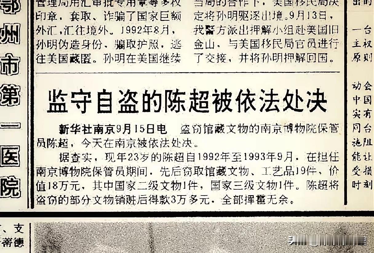 翻看90年代的老报纸,真是让人心里一惊。 南京博物院的一个保管员,才二十几岁的小年轻,居然利用职务之便监守自盗,倒卖文物搞了整整18万。 那时候的18万是什么概念? 咱们普通人一个月累死累活也就几百块工资,他不吃不喝得干上几十年才能攒够这笔钱。 这简直就是老鼠掉进了米缸里,吃得满嘴流油。 我也纳闷,这么大的博物馆,库房里的宝贝是不是多到数不清了?怎么少一件两件的根本没人对账? 估计那时候内部管理也是松松垮垮,这小伙子指不定不是第一个这么干的,只是那个倒霉被抓的“典型”罢了。 守着金饭碗,却干着挖墙脚的勾当,人性在巨额利益面前,有时候真是经不起一点琢磨。