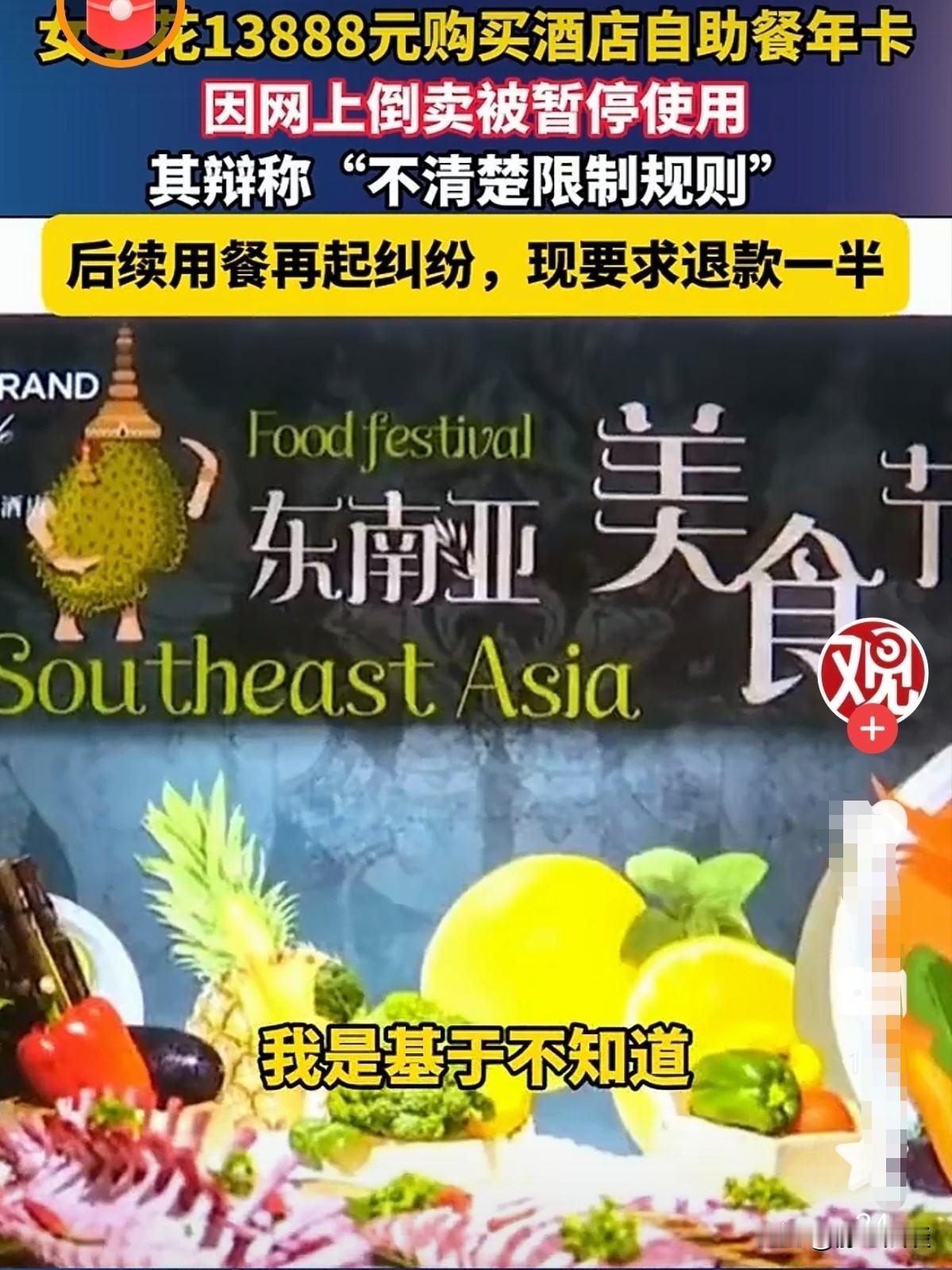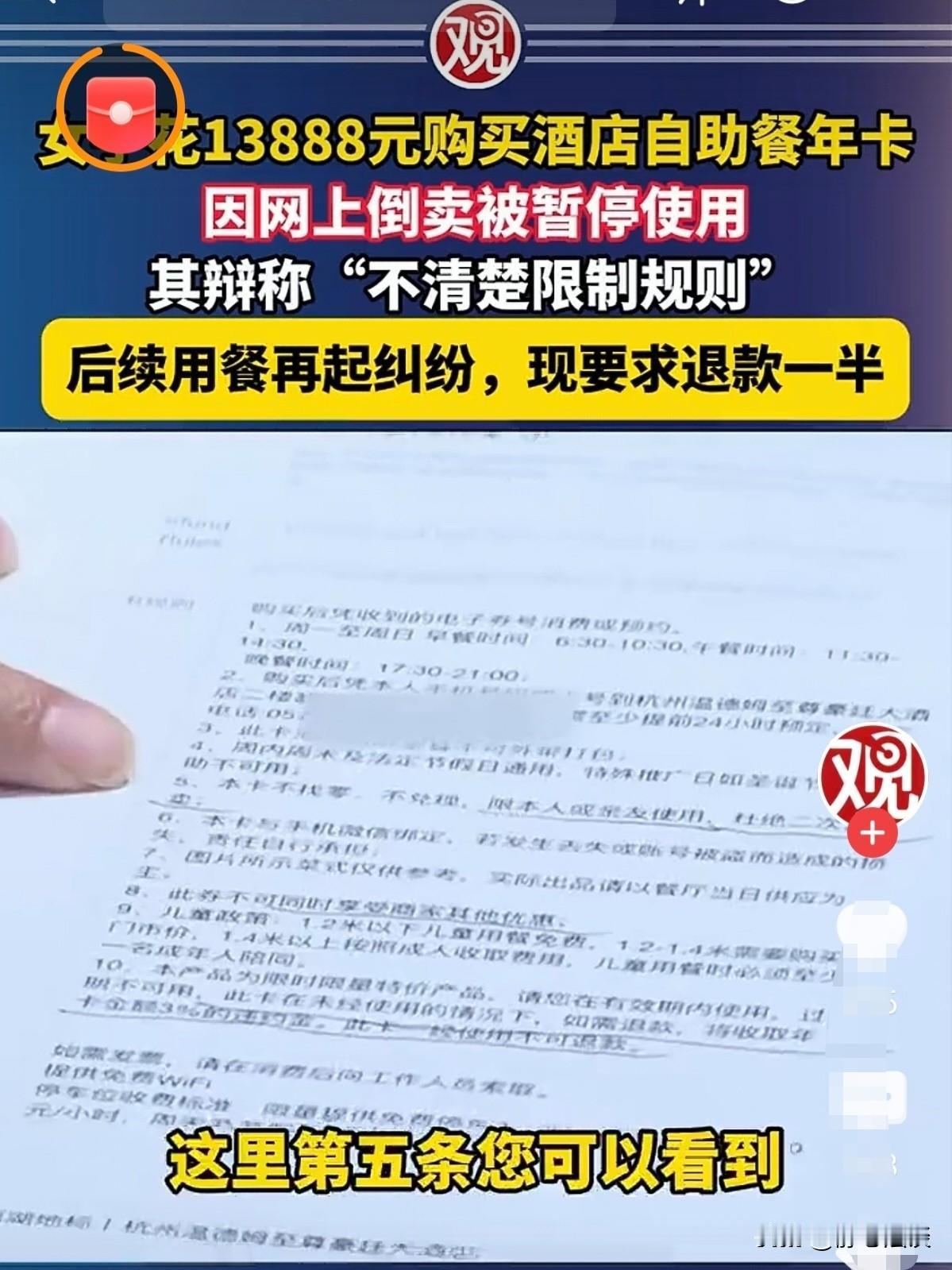 到底谁占理!浙江杭州,女子趁酒店搞活动,花13888元办了一张自助餐畅吃年卡,全年365天,每天可享用一次,早中晚不限,折算下来每次只要38元。比吃外卖划算多了,但此卡仅限本人或亲友使用。不料,她只用了4个月,年卡就被酒店停用,原因是酒店发现,她在闲鱼平台售卖卡内的用餐权益。女子对此不服,称自己并不知道酒店有禁止二次销售的规定,要求酒店退还剩余半年的卡费,酒店拒绝退费,给出解决方案,女子不接受! 庞女士拿着那张五星级大酒店的自助餐年卡,满肚子火没出发。 她花13888买的畅吃年卡,没到期就用不了,气得她直接提出退卡,却遭到酒店拒绝。 酒店那边丝毫不松口,直言按规矩办事,两边吵得面红耳赤,这事到底是怎么回事呢? 今年4月17号,庞女士像往常一样持卡酒店吃自助餐,扫二维码的时候却傻了眼。 年卡居然被暂停使用了!她急得赶紧找餐厅经理问询问情况。 没想到经理说,你在闲鱼上卖年卡权益,年卡禁止二次销售,这是违规操作,只能停卡! 庞女士当场就炸了:我只是把用不上的权益分享给亲友,怎么就违规了? 购买时说的明明白白,可以自己用,也可以亲友使用,你们这是言而无信。 她越说越委屈,之前也买过不少餐券,从来没说过不能转让,哪怕过期的餐券都能正常用。 再说这次购买年卡时,也没人提过禁止二次销售的事。 可经理也不含糊,直接调出当初的购买页面,指着底部第五条规则,这里写得明明白白‘本卡限本人或亲友使用,杜绝二次销售’,清清楚楚,赖不掉! 其实这事得从2024年双12说起,当时酒店推的自助餐年卡特别划算,13888元能吃365天,早中晚随便选。 这家五星级酒店,环境好,食材新鲜,口味独特,生意火爆,平时400多元一位。 折算下来一天才38块,吃外卖还便宜,关键吃着放心,庞女士一看性价比这么高,当场就付了钱。 买完之后,她也常去酒店用餐,前前后后用得都挺顺心,怎么也没想到,会因为“分享权益”被停卡。 酒店一开始也没把事做绝,提出让庞女士带身份证来酒店,写一份不再倒卖的保证书,再商量后续怎么解决。 可庞女士一口就拒绝了:“买卡的时候说好凭二维码就能消费,现在突然加一堆限制,事先又没说清楚,她无法接受。 她觉得自己只是帮有需要的人代用,符合“亲友使用”的条款,酒店就是故意刁难。 更让庞女士窝火的是11月28号那次用餐,那天她好不容易用卡成功,可酒店工作人员全程甩脸子。 态度差到不行,甚至隐隐有驱赶她的意思,还偷偷给她贴了“不受欢迎”的标签。 自己花一万多预付的卡,本该享受服务,结果不仅被停卡,还遭人嫌弃,这不是欺负人吗? 庞女士越想越气,干脆找了媒体曝光,就想讨个公道。 记者陪着庞女士再去酒店时,经理却有不一样的说法,其实发现庞女士卖权益后,酒店已经多次提醒制止。 可她根本不听,还换成亲友的名义继续操作,没办法才暂停了年卡。 庞女士说出实情,原来她前一段因工作需要,到外地进修了一段时间,眼看着年卡白白浪费。 就把在闲鱼上出售了8次,每次100元,还有一次没用上,还赔了人家300多元。 她认为自己有年卡使用权,只要每天不超过一次,都不过分,符合亲友使用条件。 当初买卡时说得天花乱坠,钱交给你们就不是那样了,这不行那不行,咋说咋有理。 说白了就是,我不超过365次,你别管我怎么用,13888元不能白花。 酒店方为了和气生财,表示可以协商,停卡都是按规则来的,只要她承诺不再网上卖权益,立马就能恢复使用! 可庞女士还是不认可,她觉得酒店擅自改承诺,属于欺诈营销,严重侵犯了自己的权益。 按当初的约定,年卡有效期到今年12月12号,庞女士没享受到完整一年的服务,就提出退还一半卡费。 可酒店直接拿出消费记录反驳:“4月停卡前120多天,你用了92次;11月之后又用了15次,压根没亏多少! 之后酒店又退了一步,说把年卡有效期延长到2026年11月,可还是被庞女士拒绝了,她不想看脸色吃饭,继续合作没有意义。 现在,庞女士已经把这事反映给了市场监管部门,就等着调查结果。 庞女士觉得自己权益受损,满肚子委屈。酒店说按规办事,仁至义尽。到底谁在“不讲理”,还得等监管部门给个说法。 《民法典》第496条:格式条款是当事人为了重复使用而预先拟定,按照对方的要求,对该条款予以说明。未履行提示或者说明义务,致使对方没有注意或者理解与其有重大利害关系的条款的,对方可以主张该条款不成为合同的内容。 酒店购买页第五条“杜绝二次销售”属格式条款。关键看酒店是否尽到合理提示义务(如加粗、弹窗提示、口头告知等)。 若仅在页面底部小字标注,未醒目提示,庞女士可主张该条款不纳入合同,其转让行为不构成违约;若已尽提示义务,则条款对双方有约束力。 对于庞女士年卡被停用之事,你怎么看呢?
