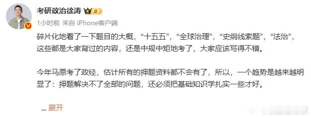 考研政治这是要一年比一年刺激吗?去年难,今年更难,明年会不会直接起飞?传统押题被针对得太明显了,不过徐涛老师还是有点东西的,押中了不少关键点。曲艺老师的模板是真的强,以后大家真的可以直接背模板了。26考研政治结束徐涛发文 曲艺模板 考研政治