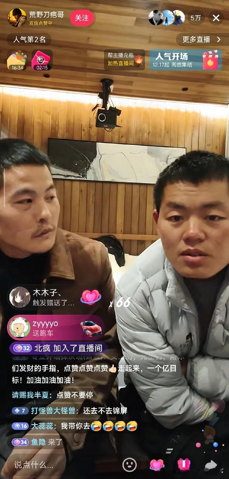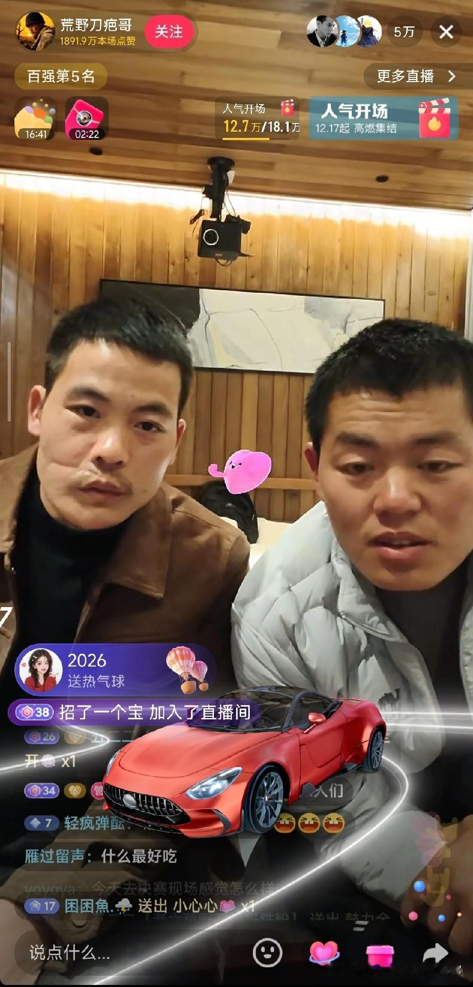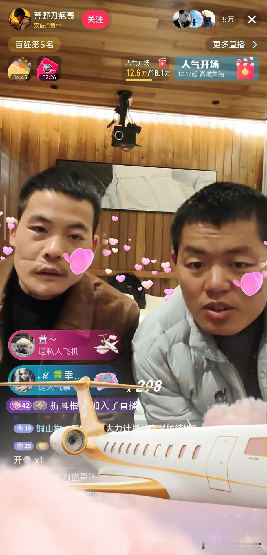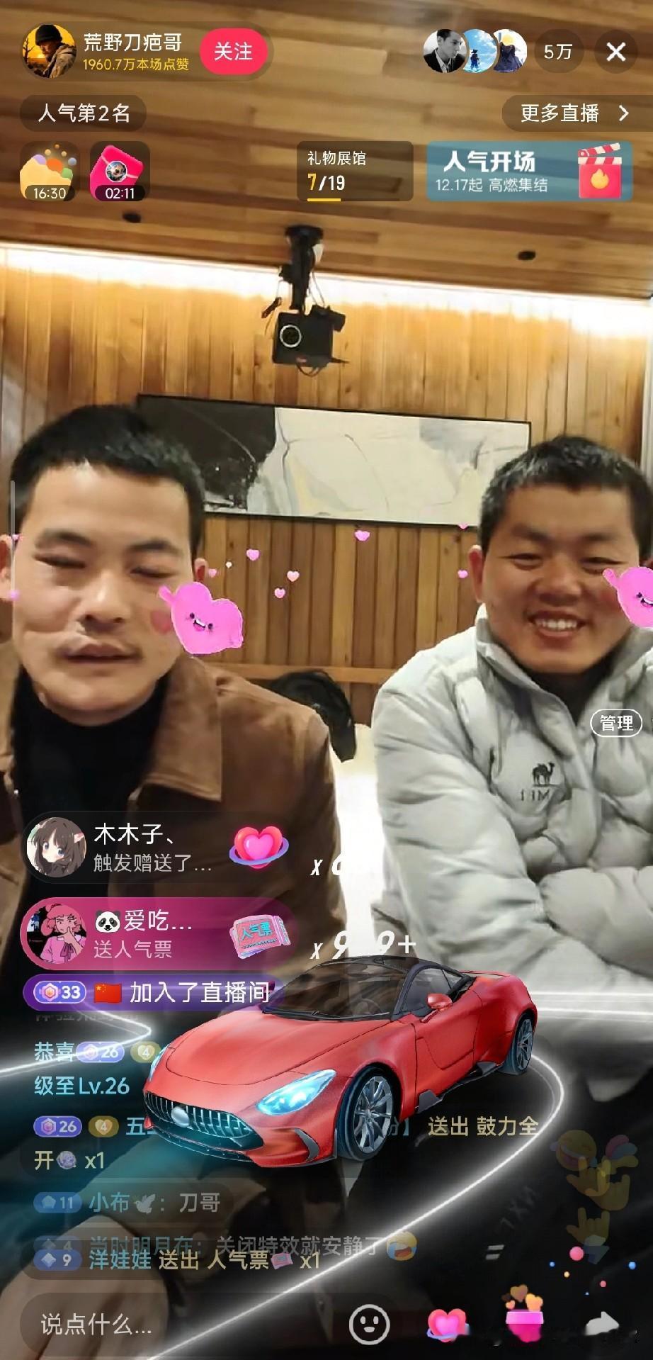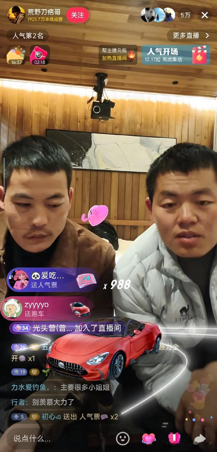 刀疤哥直播太顶了!礼物刷屏飞机跑车飞不停,这人气谁看了不眼红 点进荒野刀疤哥的直播间直接看傻眼!满屏的礼物特效压根停不下来,私人飞机刚划过屏幕,红色跑车就紧跟着冲出来,人气票更是以几百的数量级疯狂刷屏,礼物展馆进度条蹭蹭涨,本场点赞数直接飙到近两千万,百强榜、人气榜的排名一路往上冲。 镜头里的刀疤哥和同伴坐在镜头前,看着满屏的礼物特效,连表情都透着意外和惊喜,尤其是旁边大哥笑出的大白牙,简直把直播间的欢乐氛围拉满。弹幕里网友们也跟着嗨,又是喊着“点赞冲一个亿”,又是调侃要带刀疤哥去锦屏,评论区比礼物特效还热闹。 不过话说回来,有人觉得这种直播礼物满天飞是真人气,也有人说都是剧本炒作,你觉得刀疤哥的直播间热度是真实的吗?