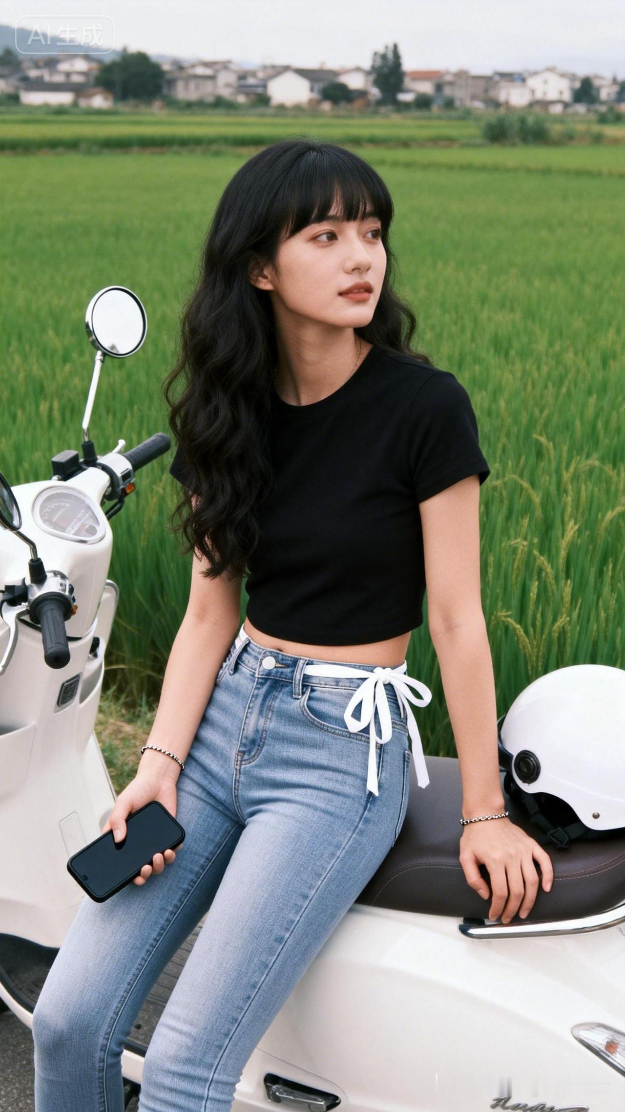 黑T恤牛仔裤,骑摩托的酷女孩,自由自在的生活态度。